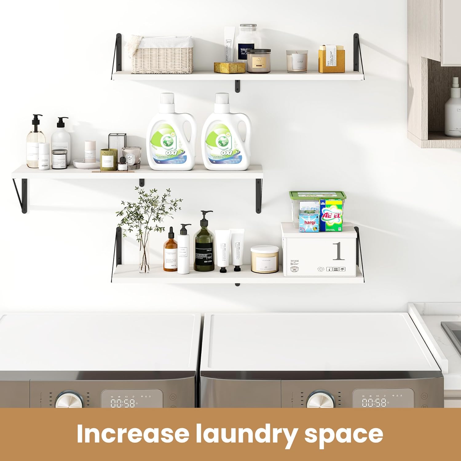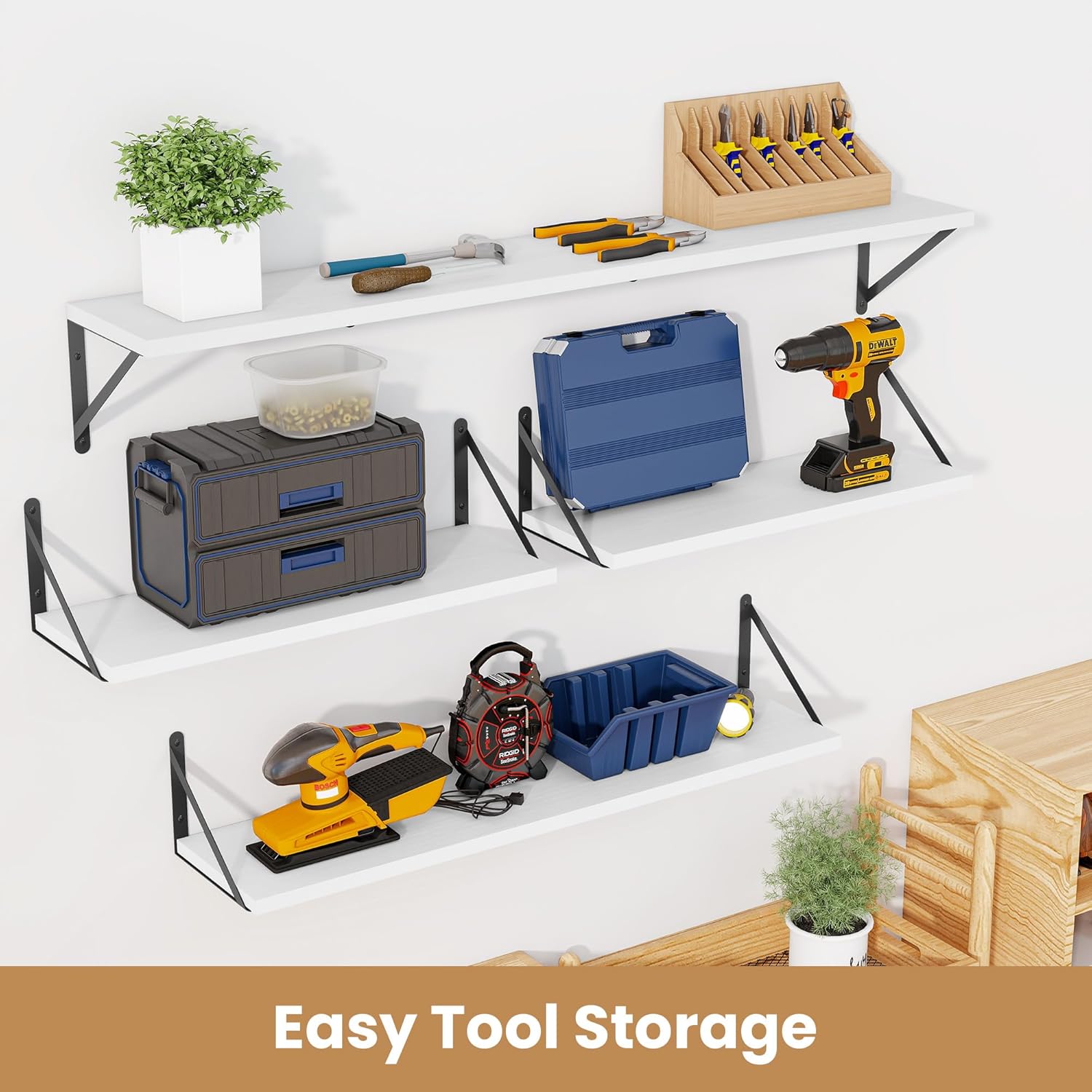 - 【Sturdy and Durable】The wall-mounted shelves are sturdy enough,with a load-bearing metal frame added in the middle,which will not deform and can withstand a weight of 40 pounds. It is very suitable for use as a wide bookshelf,TV stand,for home office,laundry room. Follow the instruction steps,including all necessary hardware,easy to assemble.
