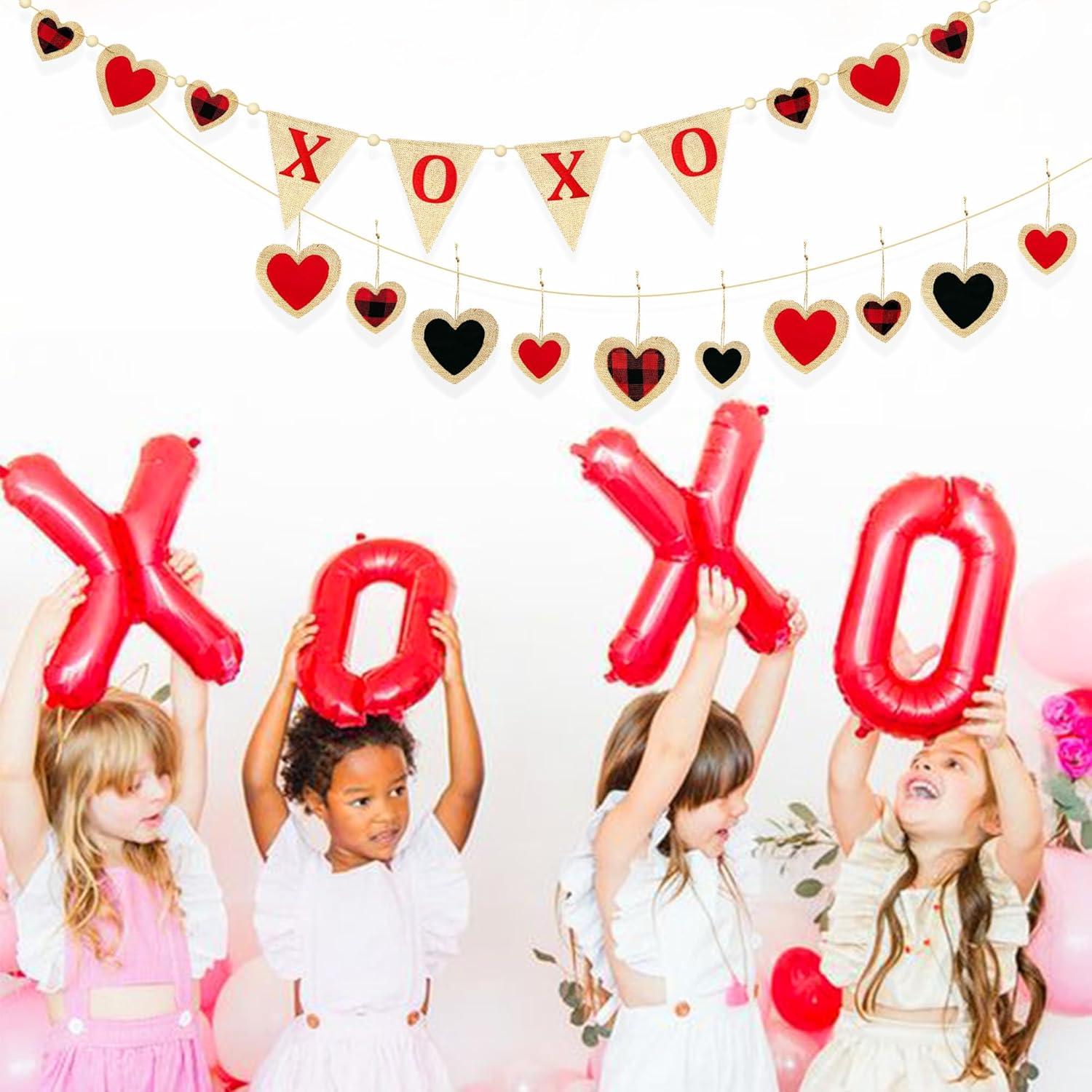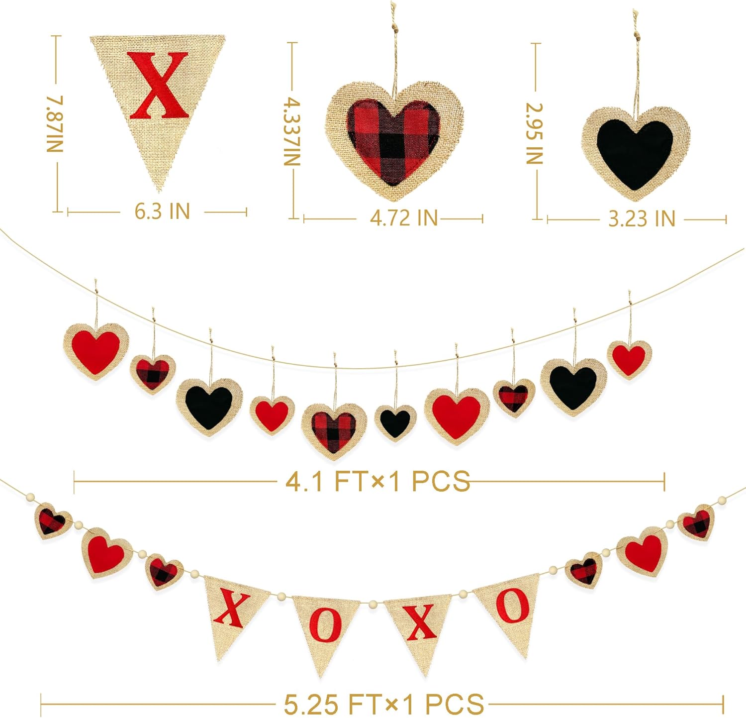- ❤️Package Contains - 1 string of valentines XOXO love heart burlap garland banner,Size of each triangle flag is 6.3 x 7.87 inch. 1 string of black red buffalo plaid fabric burlap heart garland.Size of small heart is 3.23 x 2.95inch. Size of large heart is 4.72 x 4.33 inch.
