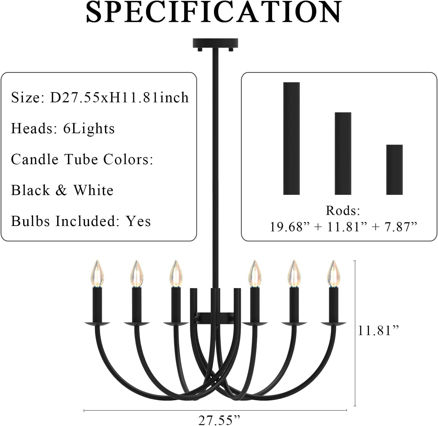 - 【Specification】 Size: D27.55xH11.81inch / D70xH30cm. The Length of Pendant Rods: 39.37inch / 100cm (Adjustable). The Rods: 7.87inch + 11.81inch + 19.68inch. Heads: 6Lights. Color: Black. Metal Tubes Color: Black + White (Includes Black and White Colors Metal Tubes). Lamp Socket: LED E12. Emitting Color: Warm White 3000K. Bulbs Included: Yes. Wattage: 18W.