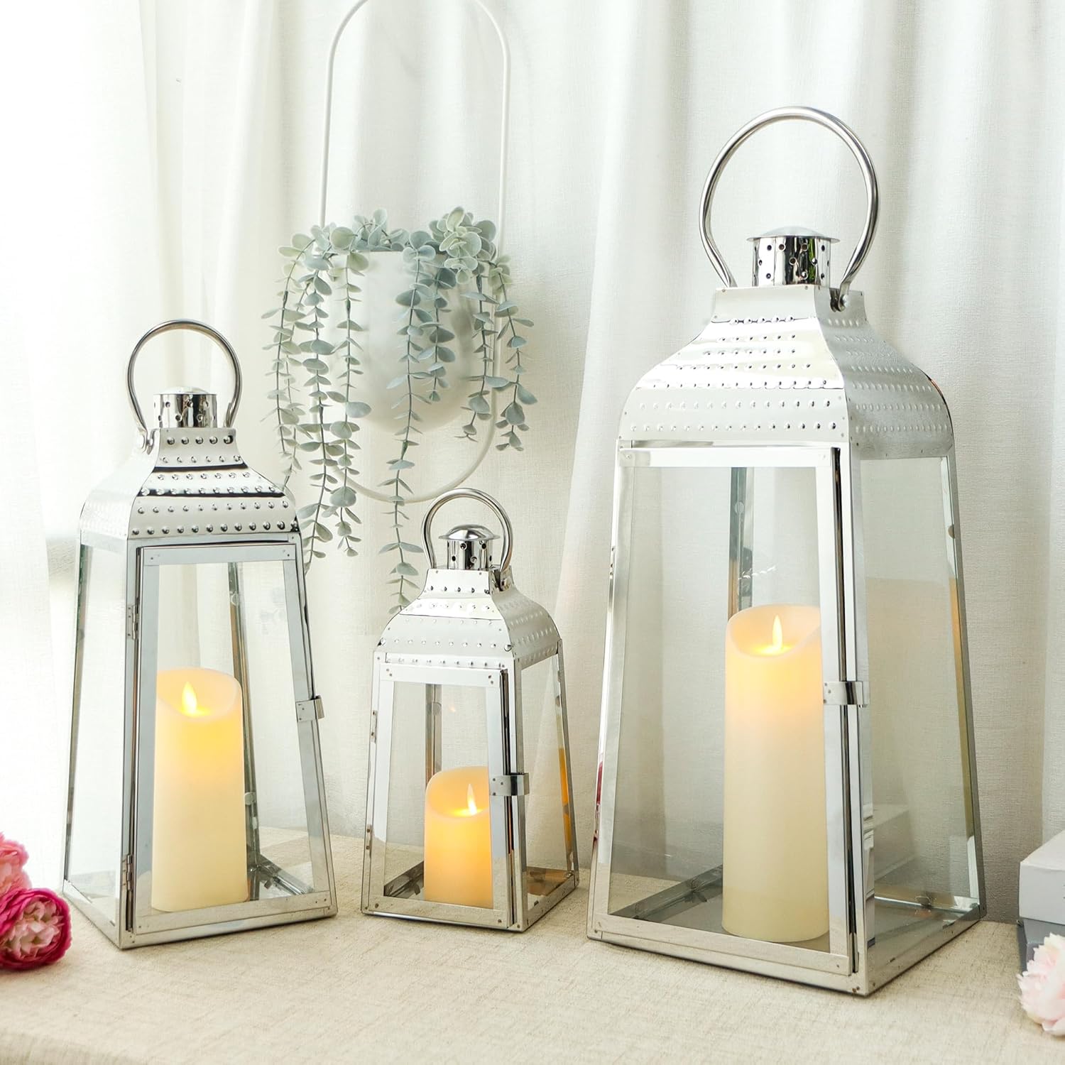 - 【Elegant Lantern Decor】 The TRIROCKS decorative lanterns in sleek silver add a touch of sophistication to any space. Crafted from stainless steel and tempered glass, these candle lanterns create a warm, ambient glow when paired with tealights. Perfect as lantern centerpieces for tables, wedding decor, or patio decor, they effortlessly enhance any setting with timeless charm.