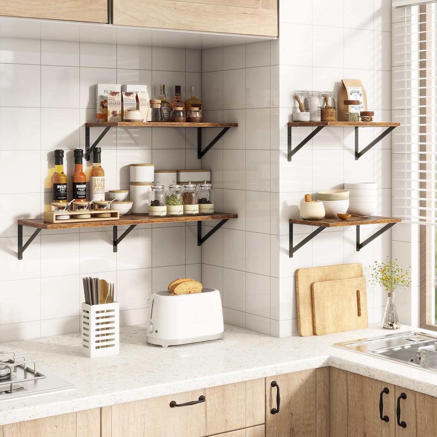 - ćFARMHOUSE RUSTIC WALL SHELFćThese floating shelves are made of premium engineered wood board and visible triangular bracket. The rustic wooden grain surface add character and warmth to any modern or traditional interior with these deep floating shelves, contrast shelves at staggering heights on the wall or mount side-by-side or in the corner for a clean streamlined look.