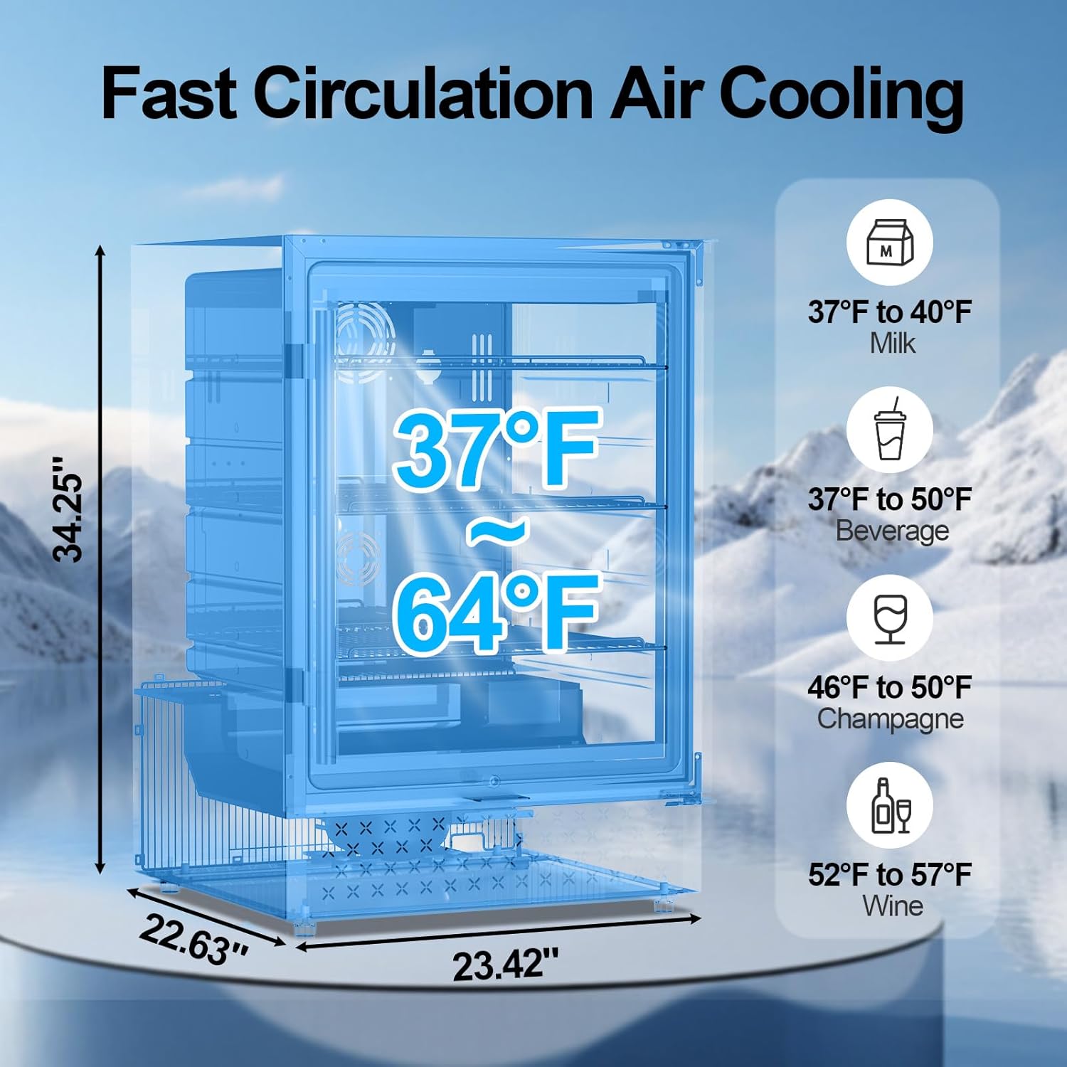 - DUAL-LAYER TEMPERED GLASS DOOR: Featuring a dual-layer tempered glass door with a seamless design, this mini drink fridge not only enhances its aesthetic appeal but also effectively insulates against external heat. The lockable door prevents accidental openings by children or pets. Additionally, it comes with blue LED lighting. The beverage refrigerator with glass door is equipped with a sensitive temperature sensor chip with memory function, meaning it will automatically return to the previous set temperature after a power outage and recovery.
