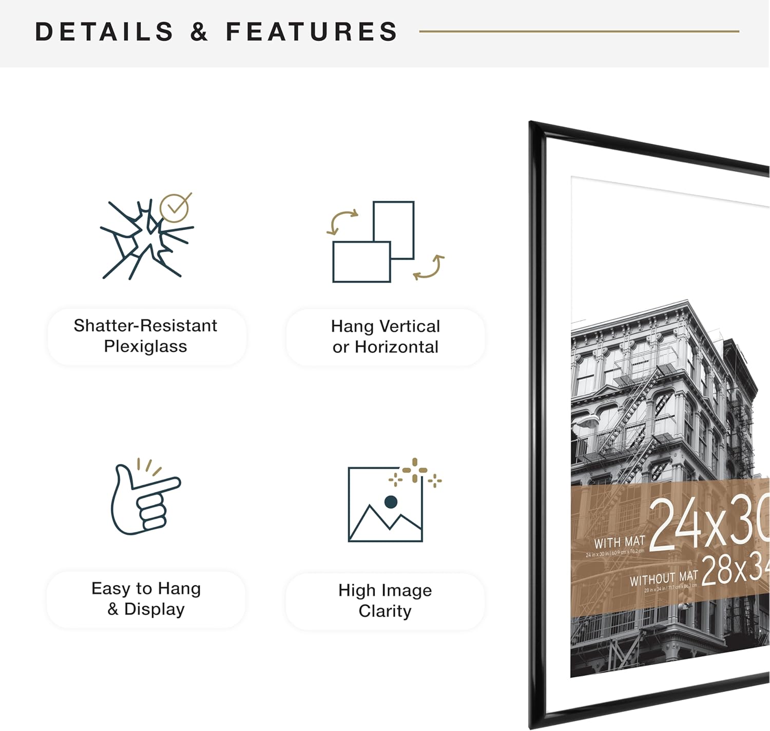 - DIMENSIONS: Each large wall picture frame features a sleek black profile & holds a 28 x 34-inch poster without the mat, or use the included mat for 24 x 30-inch display.