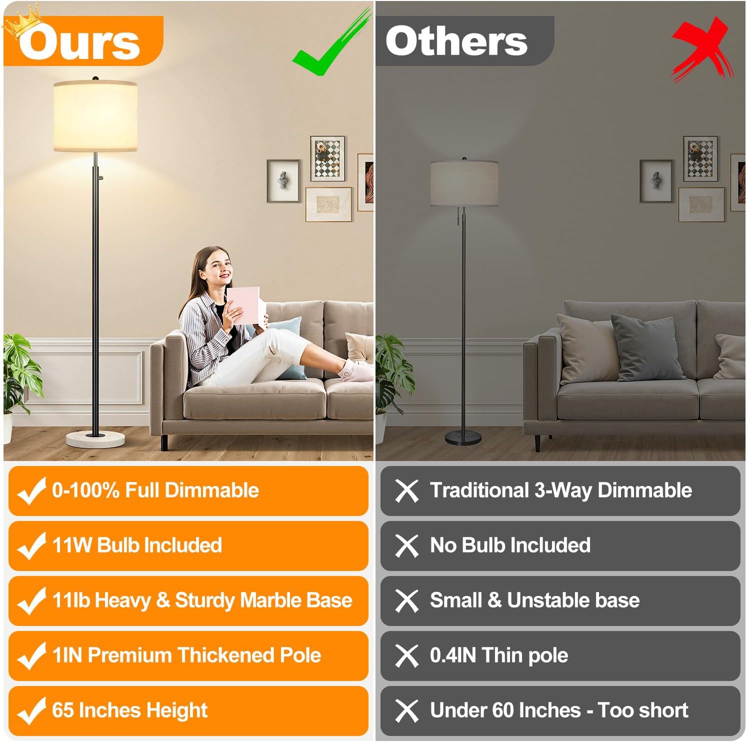 - Stepless Dimming (0-100%): Unlike traditional non-dimmable floor lamps, our dimmable floor lamp features fully stepless dimming, making it suitable for various room styles and lighting needs. With a simple turn of the knob, you can easily adjust the brightness to your preference, whether for your living room or bedroom