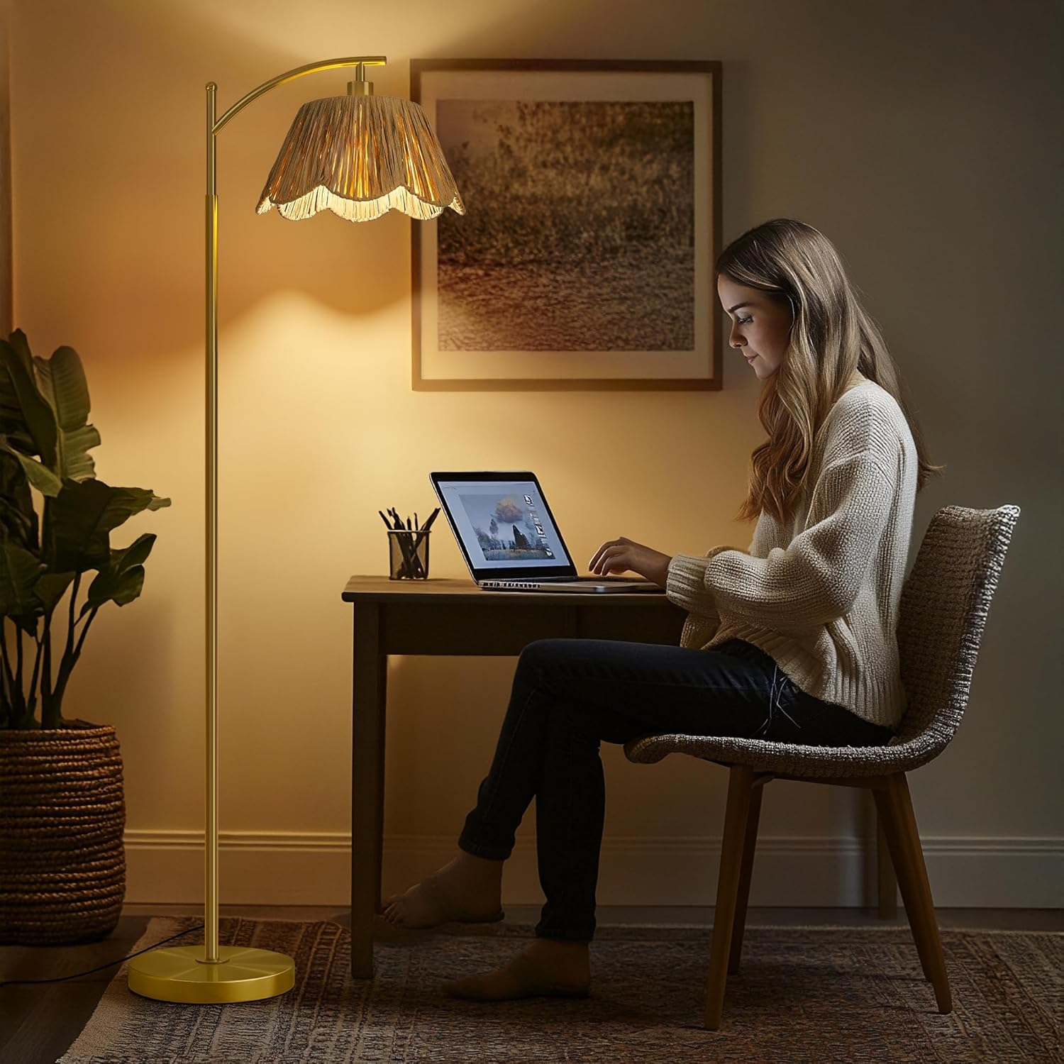 - Bohemian style to your home decor-This boho floor lamp boasts a handwoven rattan shade that enhances your home with natural charm and texture. The gold metal pole and base provide a sleek, modern contrast, making it a perfect blend of rustic charm and contemporary style. Ideal for living rooms, bedrooms, or offices, this lamp enhances any space with its timeless design.