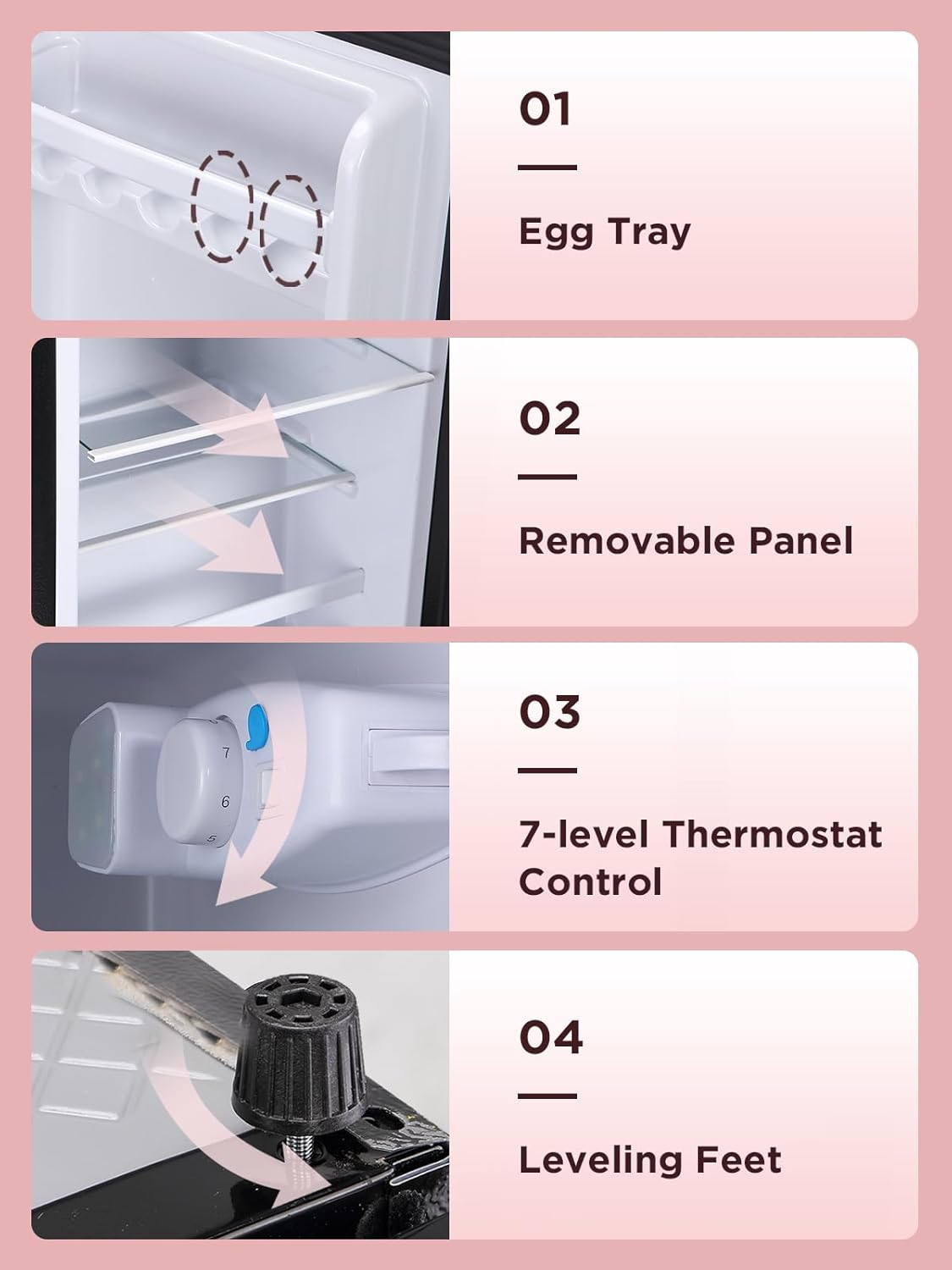 - 【Removable Glass Shelf】 This compact refrigerator comes with two detachable glass shelves. By adjusting the position of the shelves, you can put down any size of food and drinks.