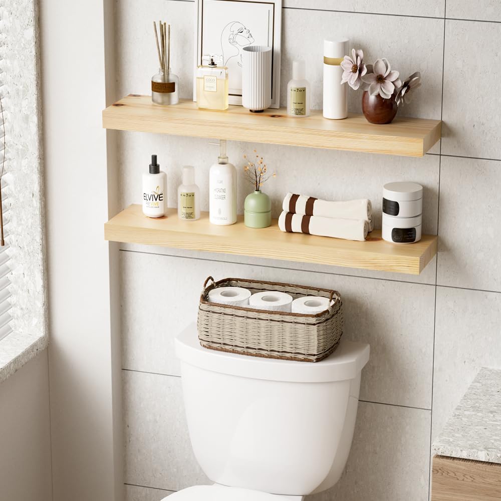 Habudda Floating Shelves for Wall, Solid Pine Wood Shelf for Bathroom Bedroom Kitchen, Rustic Room Decor, Wall Mounted, 30 Inches Long, Set of 2, Natural