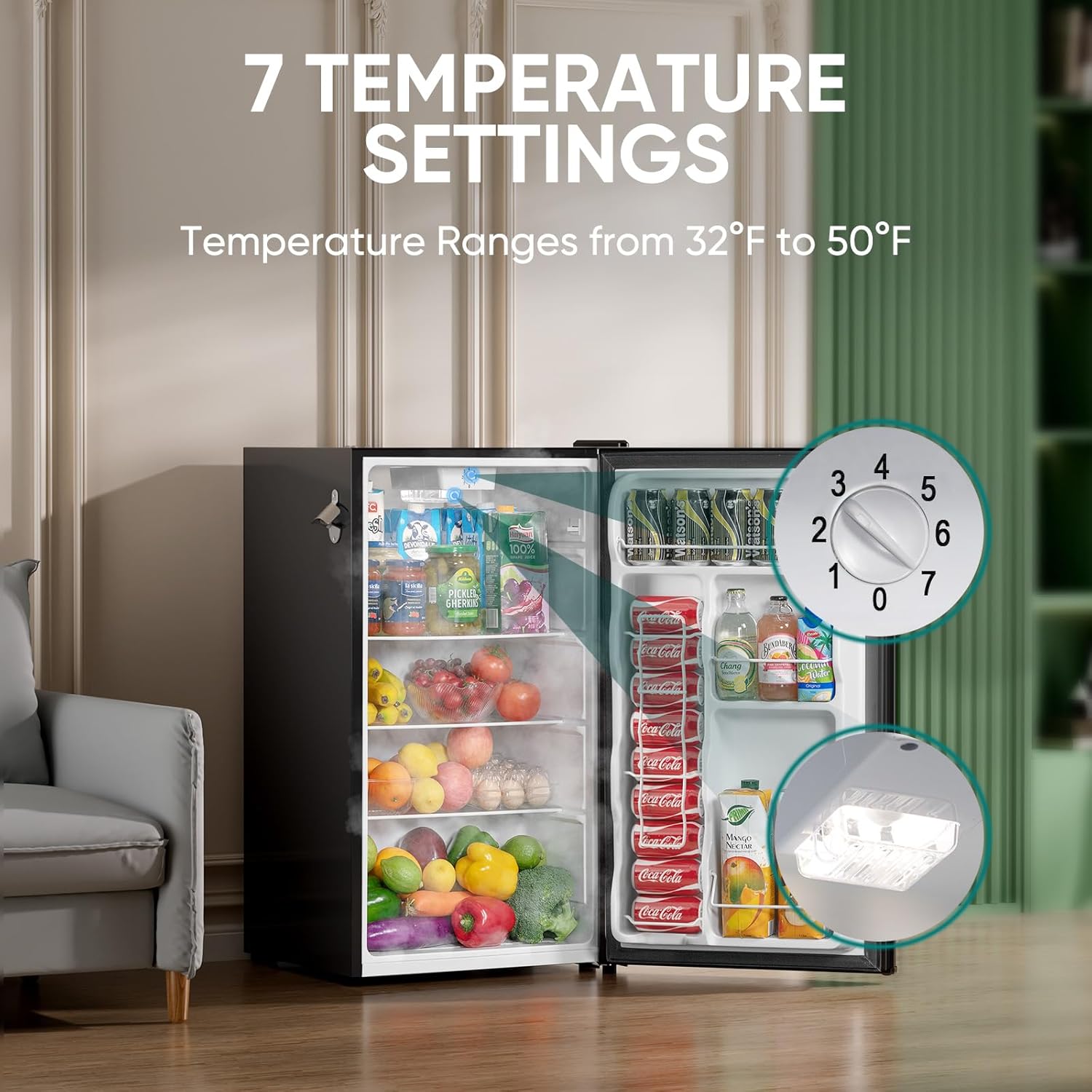 - Adjustable Thermostat: From 32°F to 50°F, this small refrigerator offers 7 temperature settings to optimize storage for different products. With its capability to cool from 86°F to 32°F in just about 3 hours, you can quickly achieve your desired temperature. The hidden evaporator design ensures a stable temperature in the refrigerator, preventing cold air from blowing directly on the food, keeping your food fresh at all time. The smart LED lighting automatically illuminates upon opening, convenient for taking food out at night