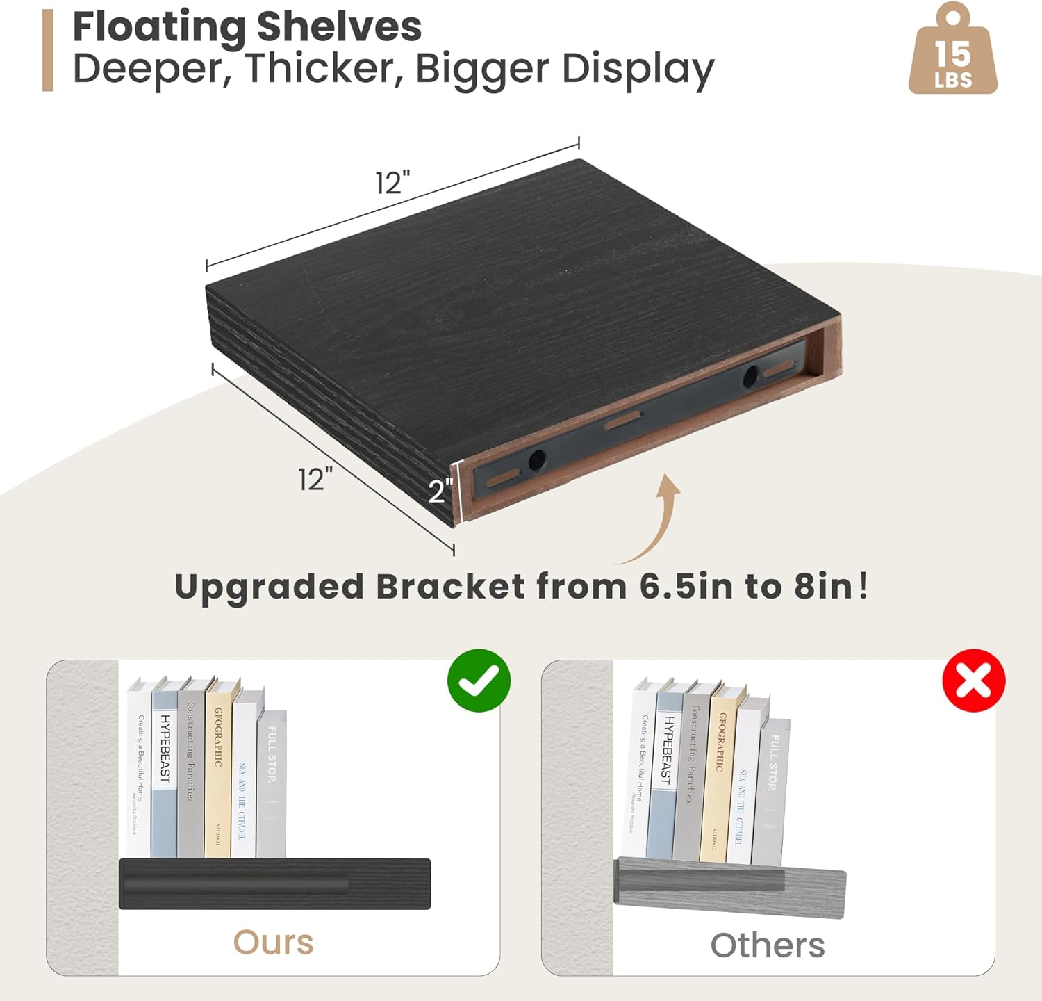 - Deep Floating Shelves- Sized in 12"L x 12"D x 2" H. These extra deeper and thicker wall shelves are 12 inches in depth and 2 inches in thickness instead of the regular narrow floating shelves, wall floating shelves are fixed with solid dual-pipe iron stands and a stable wall shelf It is an ideal place to display your beloved photos, trophies, and other delicate decorations.