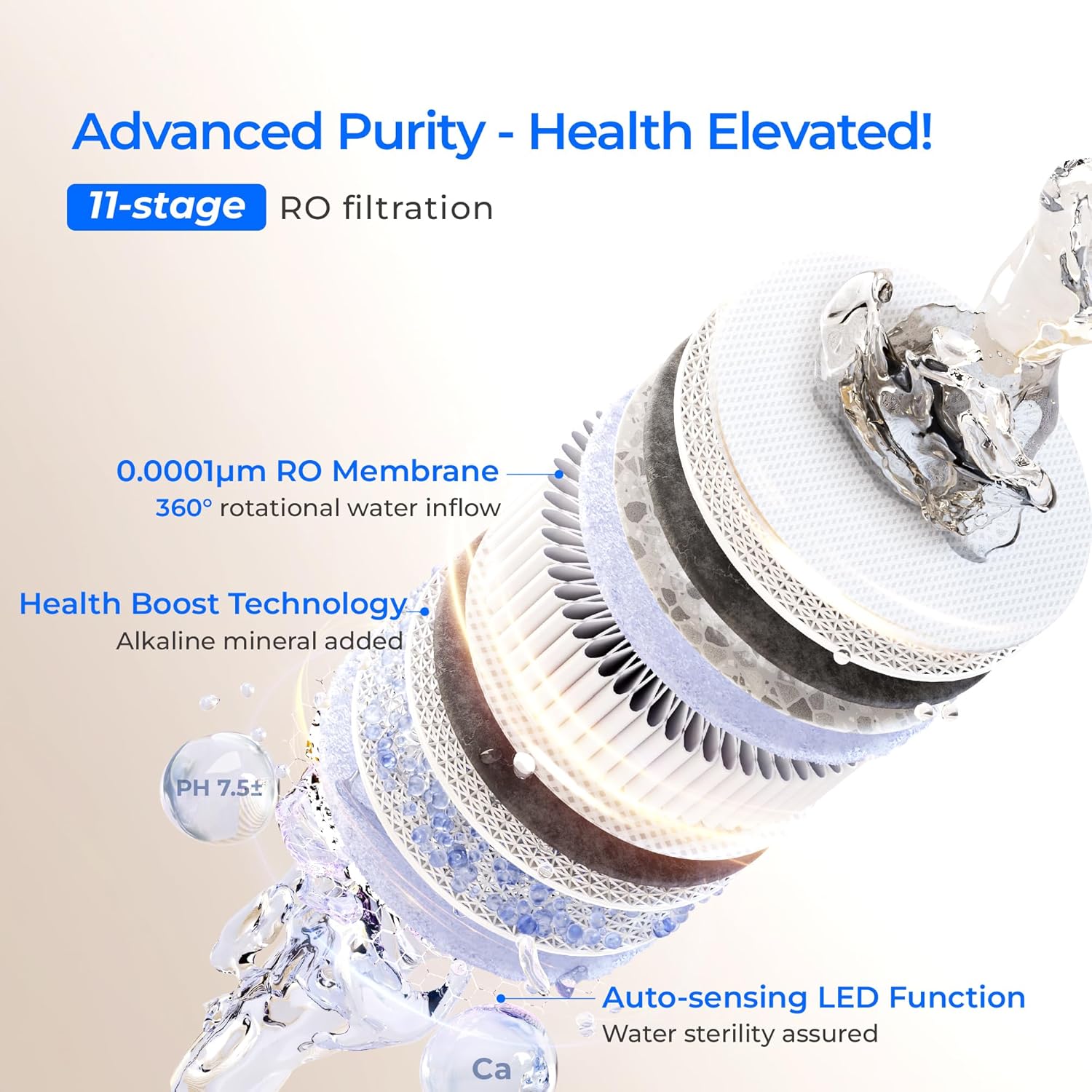 - [ 11-stage RO Filtration ] This reverse osmosis water filter features 11-stage precision filtration including a robust 0.0001μm RO membrane, composed of 16 layers. Enhanced with an LED light for assured water safety. It has been tested by SGS to reduce TDS, PFOA, PFOS, Chlorine, Fluoride, Arsenic, Lead and more, delivering healthy, pure water for you.