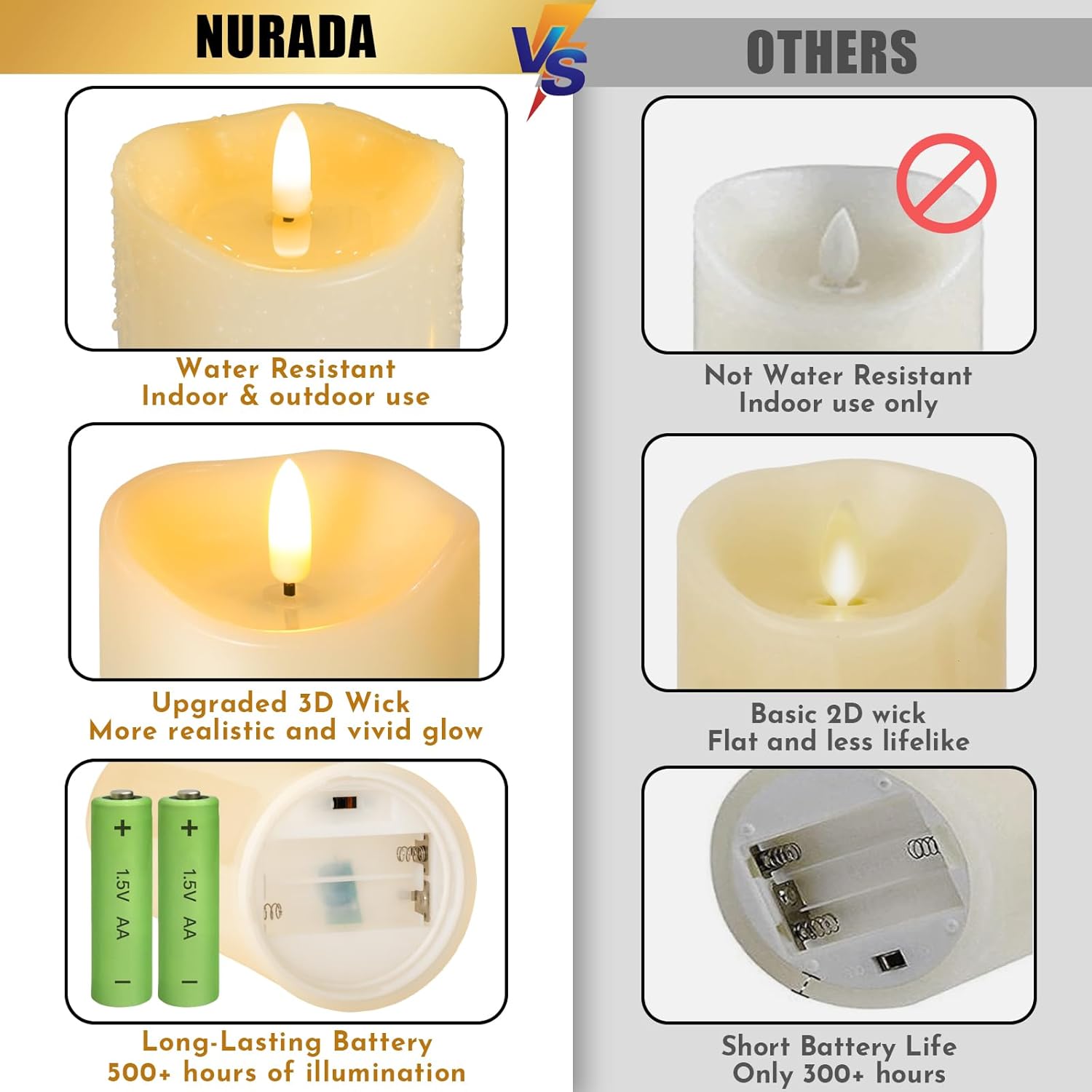 - IP44 Outdoor Waterproof Flameless Candles: Made from durable, thicken, waterproof plastic and Eco-Wick, they feature a solid screw-in waterproof base and sealing gasket to hide the main accessories inside the waterproof shell,ensuring long-term use in outdoor and indoor settings. Perfect for decorating patios, porches, home, fireplace, bedroom and table centerpieces. Unlike traditional candles, these electric candles don't melt or warp in different weather conditions