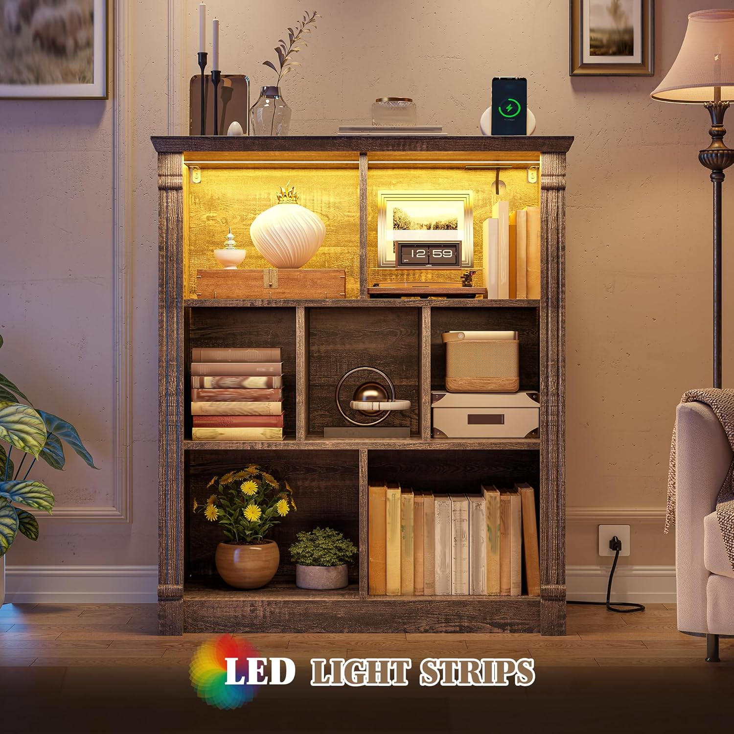 EnHomee 7 Cube Bookshelf Cubby Storage Organizer with LED Lights and Charging Station, Wood Shelf Display Cabinet for Bedroom, Living Room, Office Black Oak