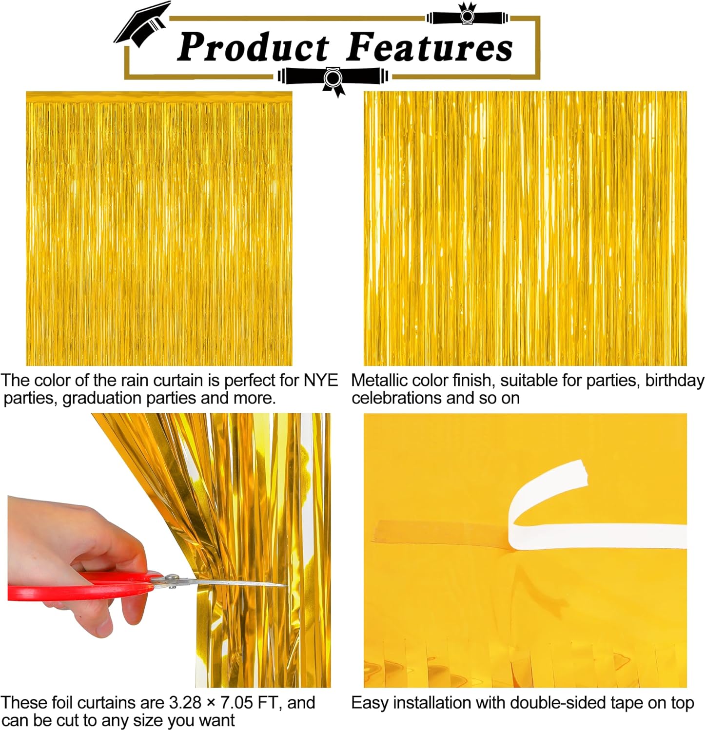 - Easy to Install: The top of the gold foil curtain come with an adhesive paper, which can be simply peeled off to easily stick to any smooth surface, quick and easy to install.