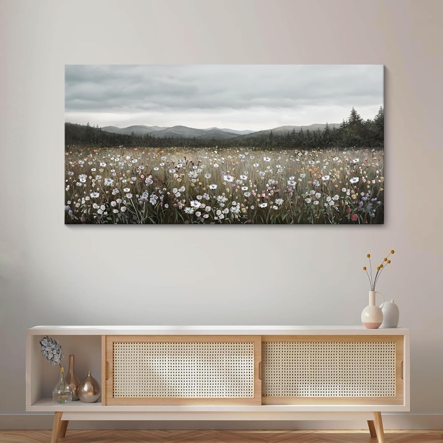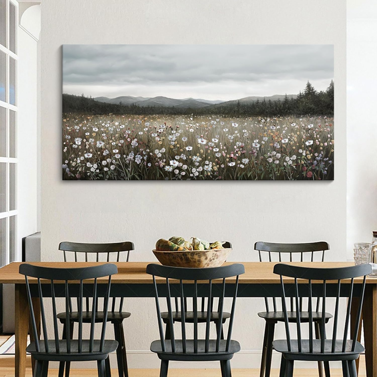 - Floral wall art: The serene mountain and floral landscape design complements living rooms, bedrooms, dining rooms, or even cozy cabins, bringing a touch of nature’s beauty indoors.