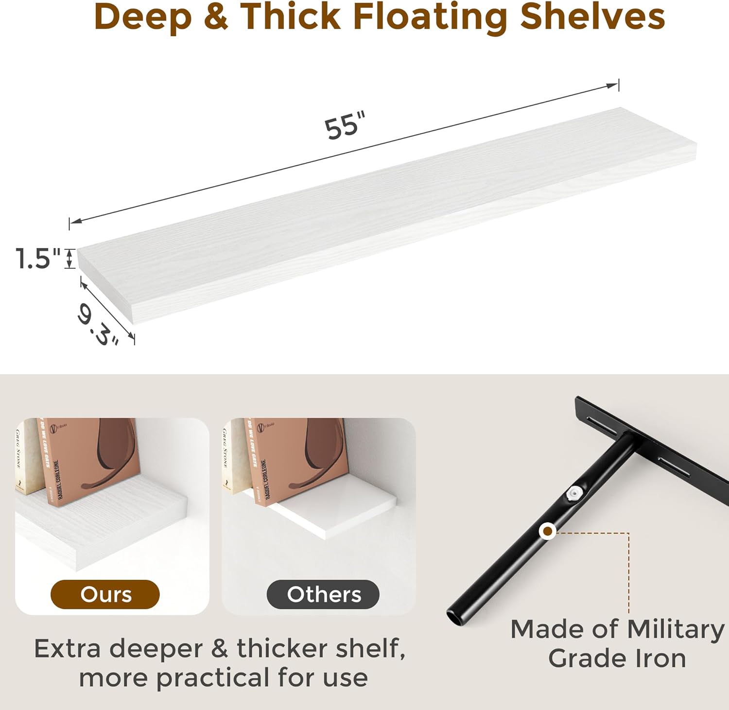 - 【9 INCH DEEP FLOATING SHELF】This extra deeper and thicker wall shelves are 9.3 inches in depth and 1.5 inches in thickness instead of the regular narrow floating shelves, you can put photos, pictures, DVD players, videos, books, toys, and some other knickknack on this beautiful display wooden shelf.