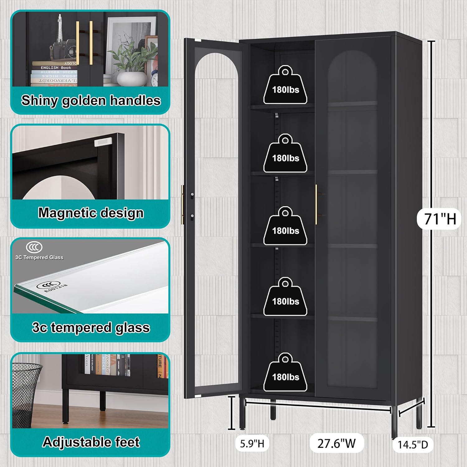 - ćGlass Door BookcasećThis 71" tall glass cabinet features two upgraded tempered glass doors, providing a clear view of your books and collectibles. The transparent tempered glass allows you to quickly locate your favorite books or display items without opening the doors. The sleek design is complemented by shiny golden door handles, adding a touch of elegance to any room. The glass doors are easy to clean, ensuring your bookcase always looks pristine. An excellent choice for upgrading home and office