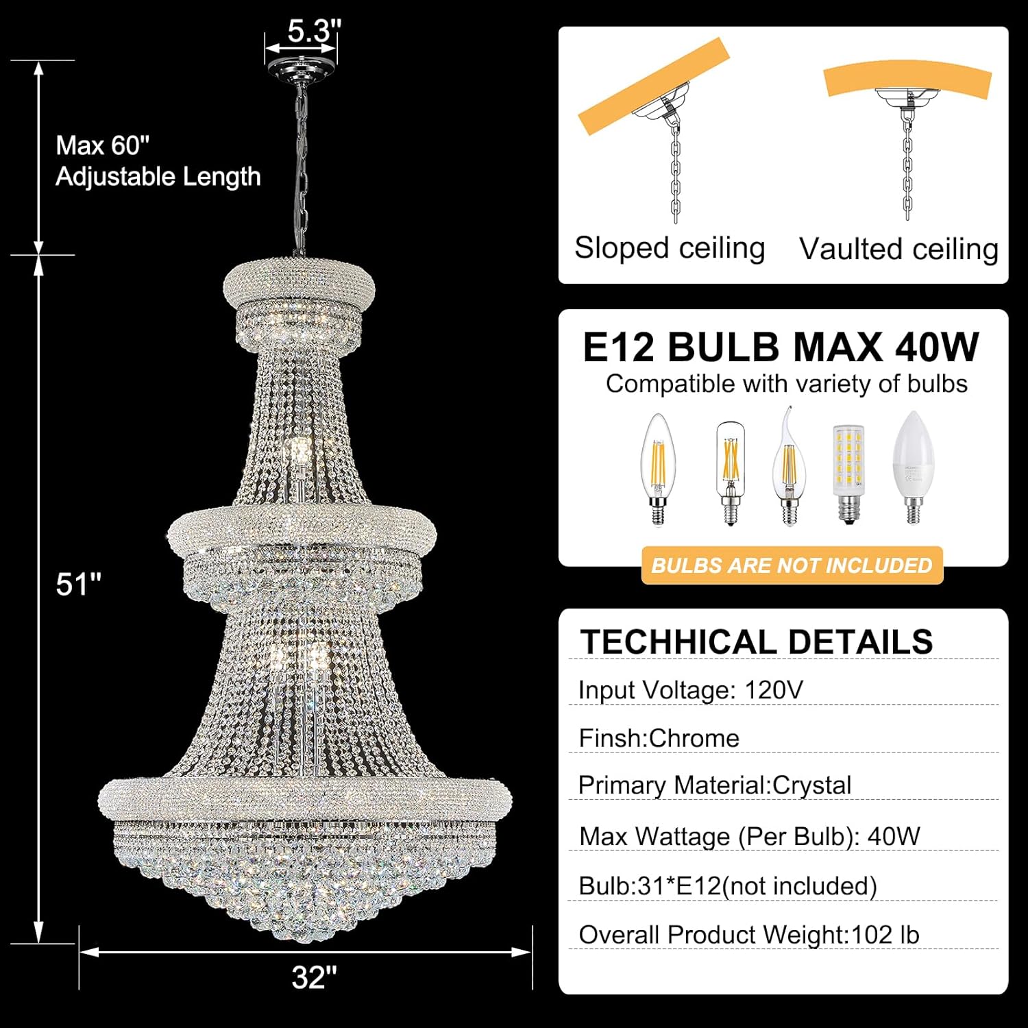 - Dimmable function: The Crystal Chandelier Lighting is compatible with any E12 bulbs. 31 Bulbs Required.ļ¼Bulbs not includedļ¼