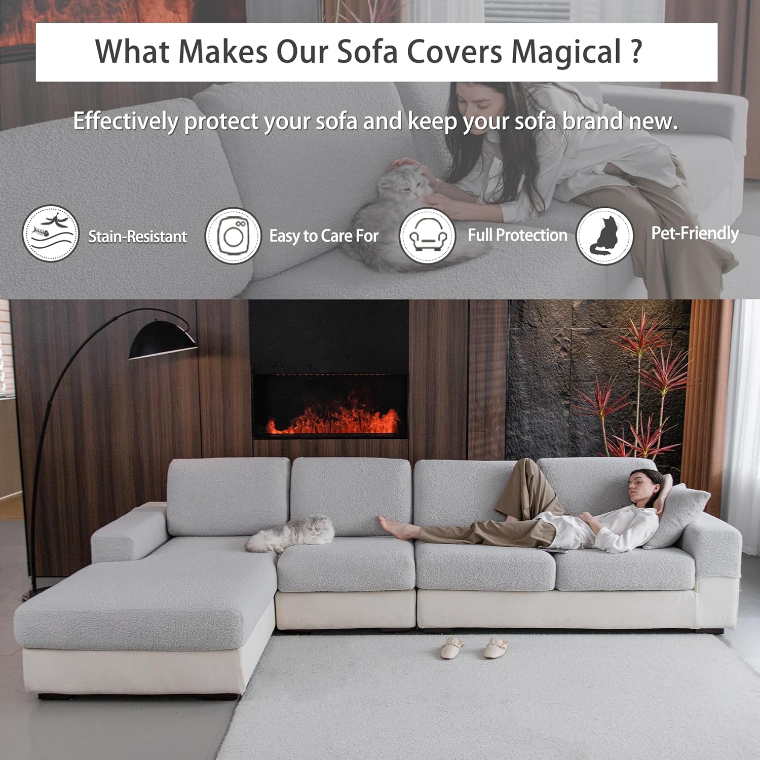 Couch Cushion Covers for Sectional Sofa, Stretch Soft Sofa Slipcovers Washable Wear-Resistant Universal Furniture Protector for Living Room(3 Seaters Covers+1 Chaise Cover, Light Gray)