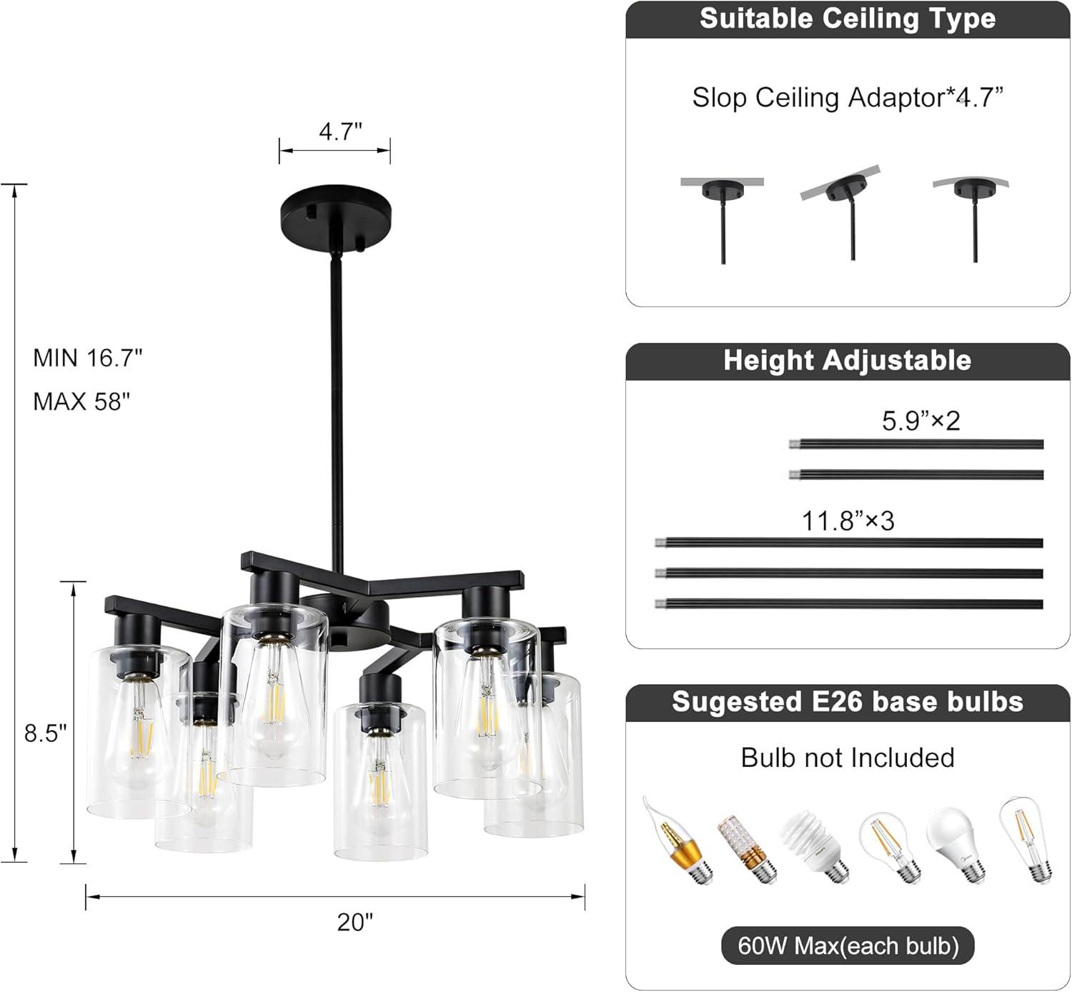 - Height Free Adjustment: This dining room light fixture over table Diameter: 20 inches, Height: 16.7~58 inches. Lampshade diameter: 4.7 inches. Comes with two 5.9 inches and three 11.8 inches rods to flexibly adjust the hanging height of your living room light fixture.Accommodates sloped ceilings
