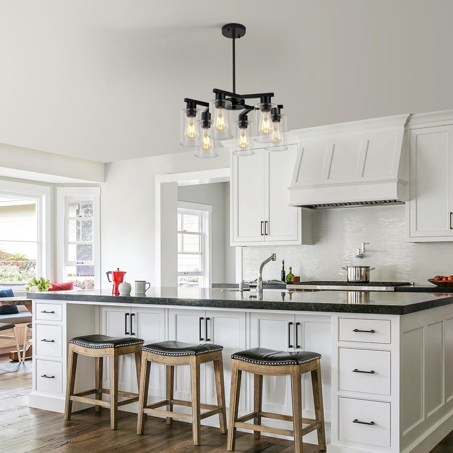 - Unique Design Aesthetic:Modern farmhouse chandelier features a matte black metal frame and 6 clear glass shades, creating visual tension between the cool, hard metal and lightweight glass. Dining room chandelier features a 360° downward glare-free design that reduces dust accumulation by 70%. Black light fixture is ideal for kitchen islands, dining tables, living rooms or bedrooms