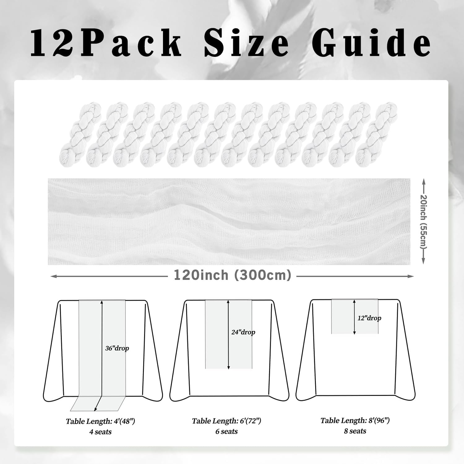 • Cheesecloth Table Runner Size: You will receive 12 white cheesecloth tablerunner, each measuring 20 x 120 inches. The quantity is sufficient for you to decorate various romantic occasions. It can decorate most shaped tables, such as rectangular tables, round tables, and cocktail tables. It is long enough to decorate a large table and be placed perfectly and elegantly on the tabletop, adding a romantic atmosphere to your occasion.