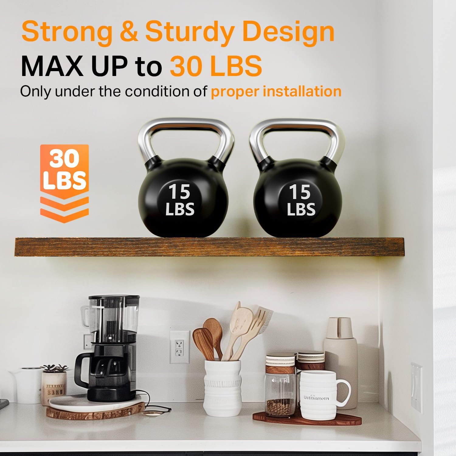 - 𝐒𝐭𝐫𝐨𝐧𝐠 𝐋𝐨𝐚𝐝 𝐂𝐚𝐩𝐚𝐜𝐢𝐭𝐲 – Made from 𝐝𝐮𝐫𝐚𝐛𝐥𝐞 𝐞𝐧𝐠𝐢𝐧𝐞𝐞𝐫𝐞𝐝 𝐰𝐨𝐨𝐝 and reinforced with sturdy brackets, each shelf 𝐬𝐮𝐩𝐩𝐨𝐫𝐭𝐬 𝐮𝐩 𝐭𝐨 𝟑𝟎 𝐥𝐛𝐬, making them ideal for books, plants, toiletries, or decor