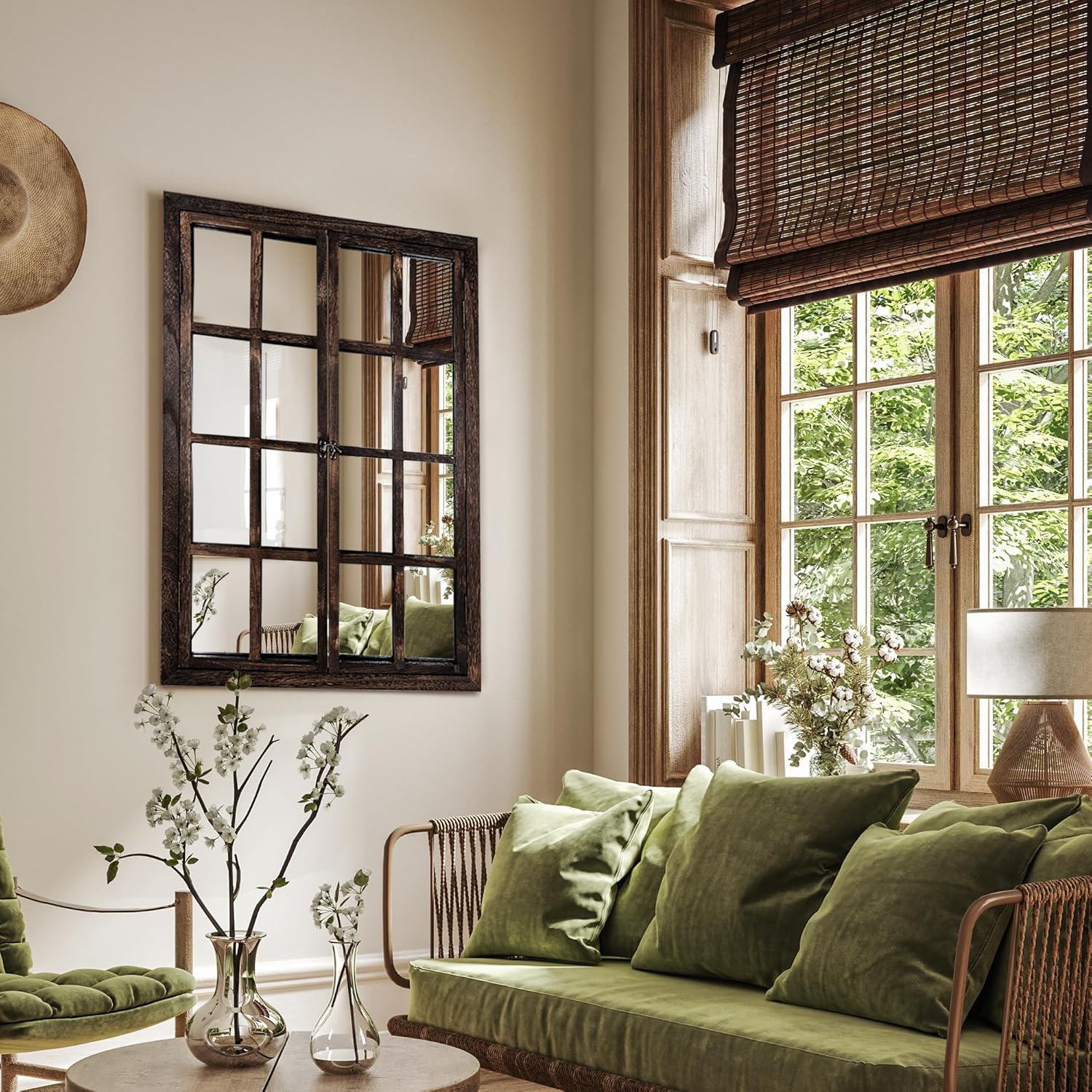 Wall Mirror with Window Design, 36"x24" Rustic Farmhouse Wood Mirror for Wall Decor, Decorative Vintage Mirror for Living Room, Bedroom, Entryway
