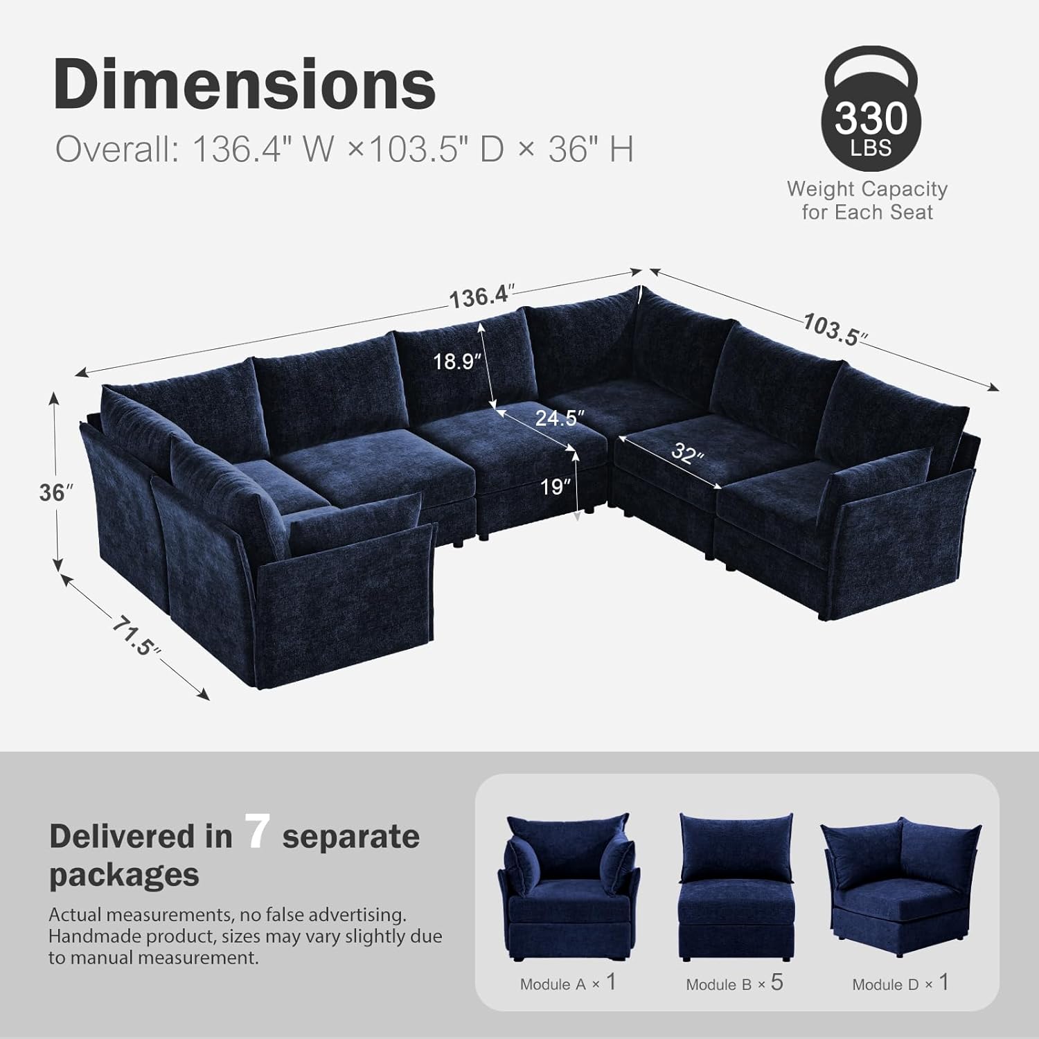 - đź’ˇ Stylish and Spacious Sectional Sofa - A blend of modern elegance and comfort, this blue sofa is ideal for contemporary interiors. Customize seating and shape by adding or removing modules to fit your needs. It's perfect for your living room, family room, bedroom, or office. Overall size: 136.4" W Ă— 103.5" D Ă— 36" H, seat width: 32", seat depth: 24.5".