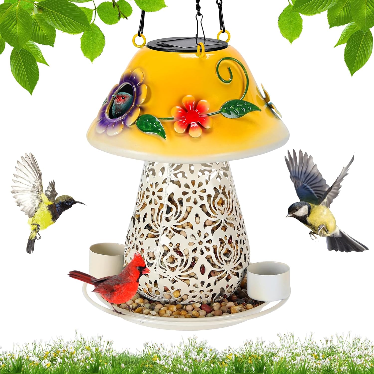 Mushroom Solar Bird Feeders for Outdoors Hanging Metal Wild Bird Feeder Garden Lantern with S Hook for Garden Decoration Yellow