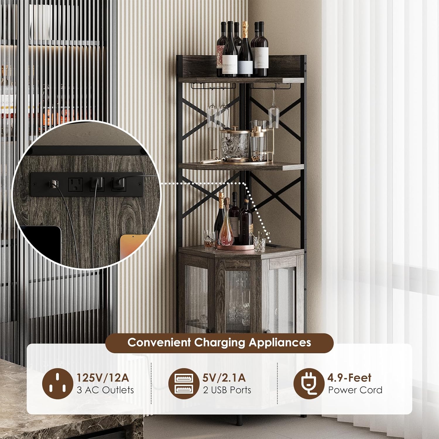 - 【Corner Bar Cabinet with Charging Station】 This corner cabinet features 3 power outlets & 2 USB ports, allowing you to conveniently charge coffee makers, blenders, phones, and bar accessories—no extra power strips needed! The 4.9FT cord provides flexibility, making it perfect for your home bar, kitchen, or living room. A must-have bar stand for home with smart functionality!
