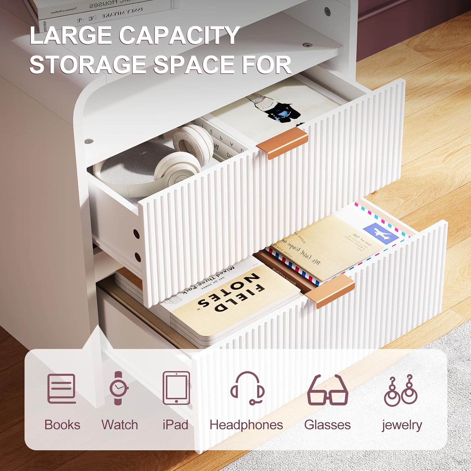 FURSUN 24" Fluted Nightstand Set of 2 with Charging Station, Wooden End Table with 2 Drawers Storage, Curved Profile Design, Modern Bedside Cabinet for Bedroom Living Room, White