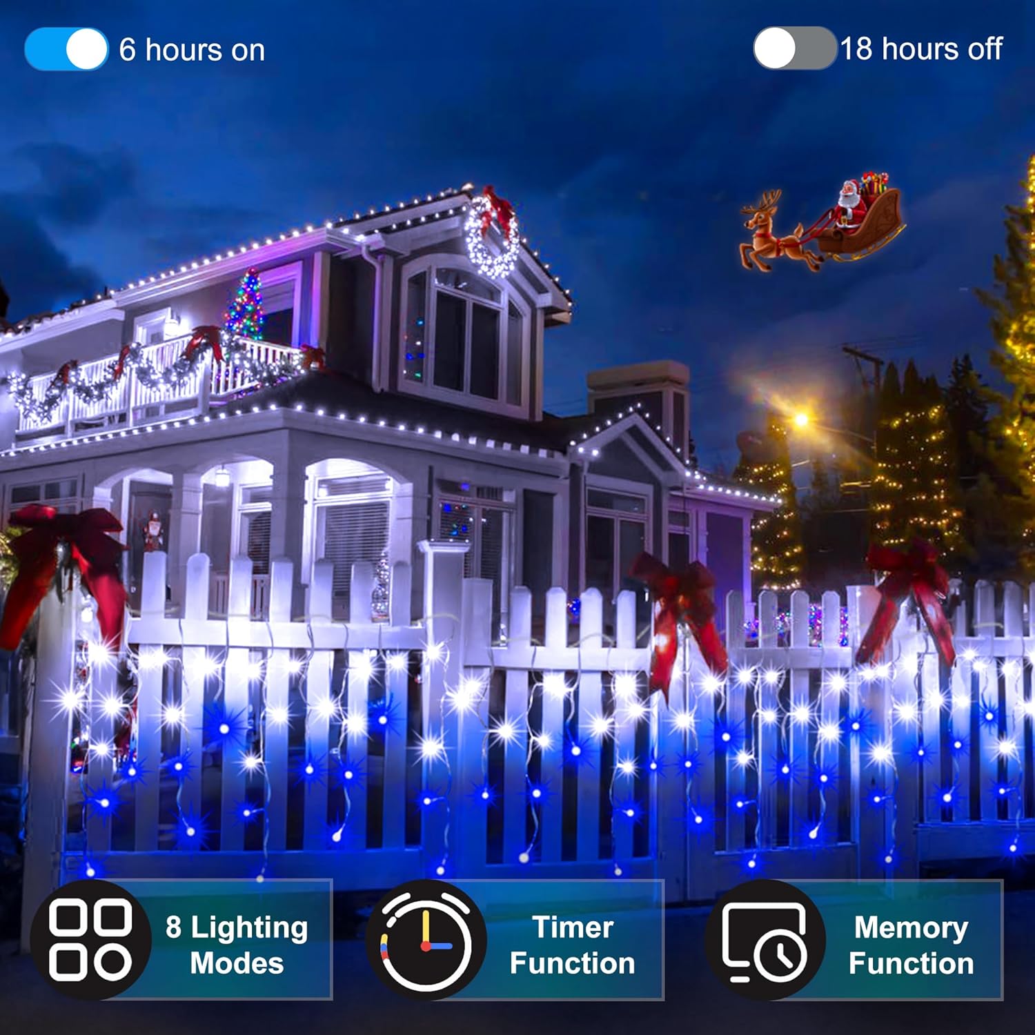 - 6-Hour Auto Timer : Enjoy convenient automated lighting with the built-in timer that turns your lights on at dusk and off after 6 hours each night. Perfect for decorating high eaves, garden shrubs, pathways, and balconies without daily manual intervention. These Christmas holiday lights provide reliable illumination whether you're hosting holiday gatherings or away traveling