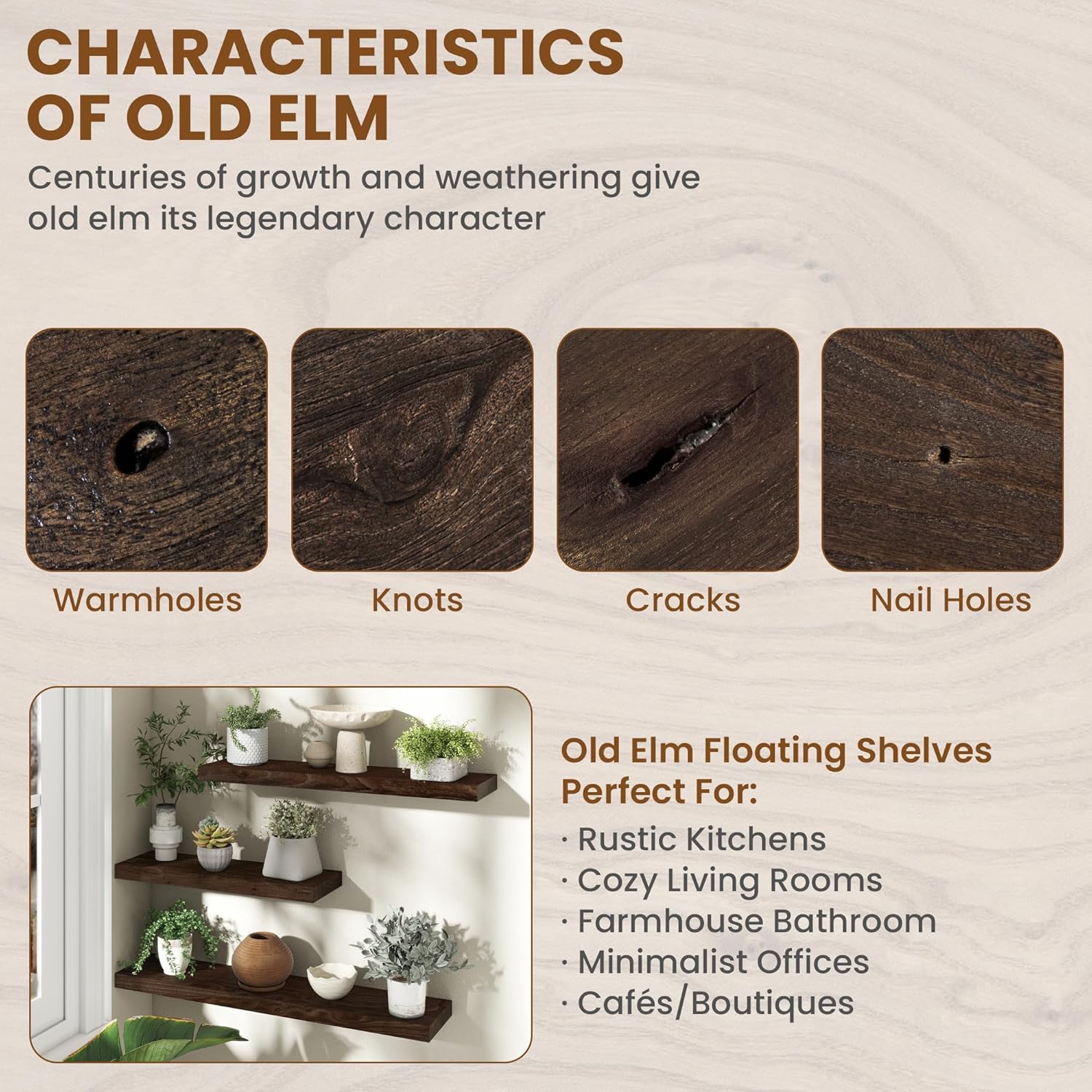 - REAL SOLID ELM WOOD: These elegant elm wood floating shelves showcase the natural beauty of solid timber with a clean, minimalist design. The rich, warm tones and distinctive grain patterns of elm create organic visual interest, while the smooth, sanded surface offers a soft tactile feel.