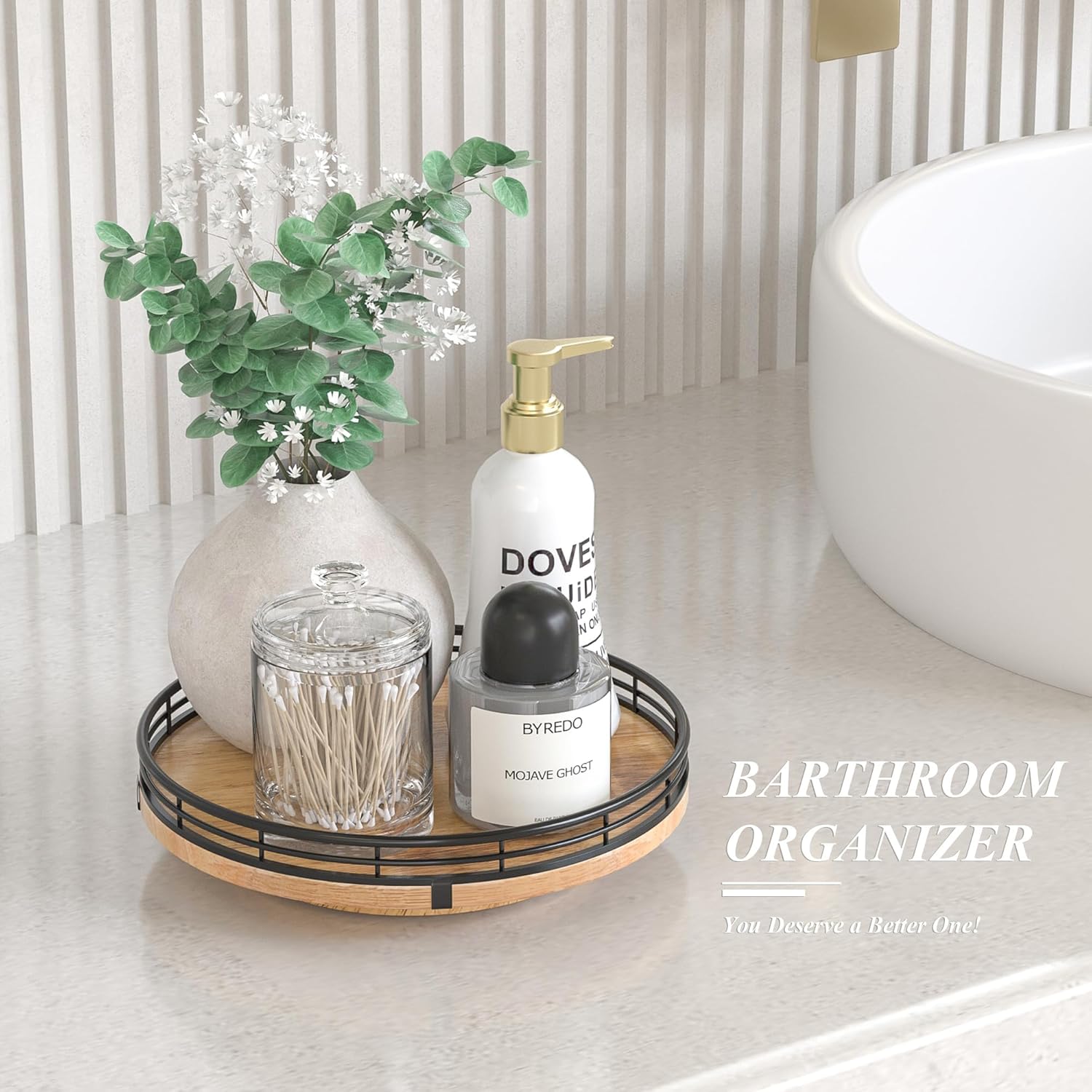 - UPDATED DESIGN: With larger wood base on this lazy Susan for table top, the turntable organizer doesn't wobble, even with heavier items on it. With premium oak wood and classical iron fence make this lazy Susan turntable stylish, functional and adding a touch of rustic charm. itās also very easy to clean. There are included anti-slip pads on the bottom of the lazy Susan for extra surface protection.