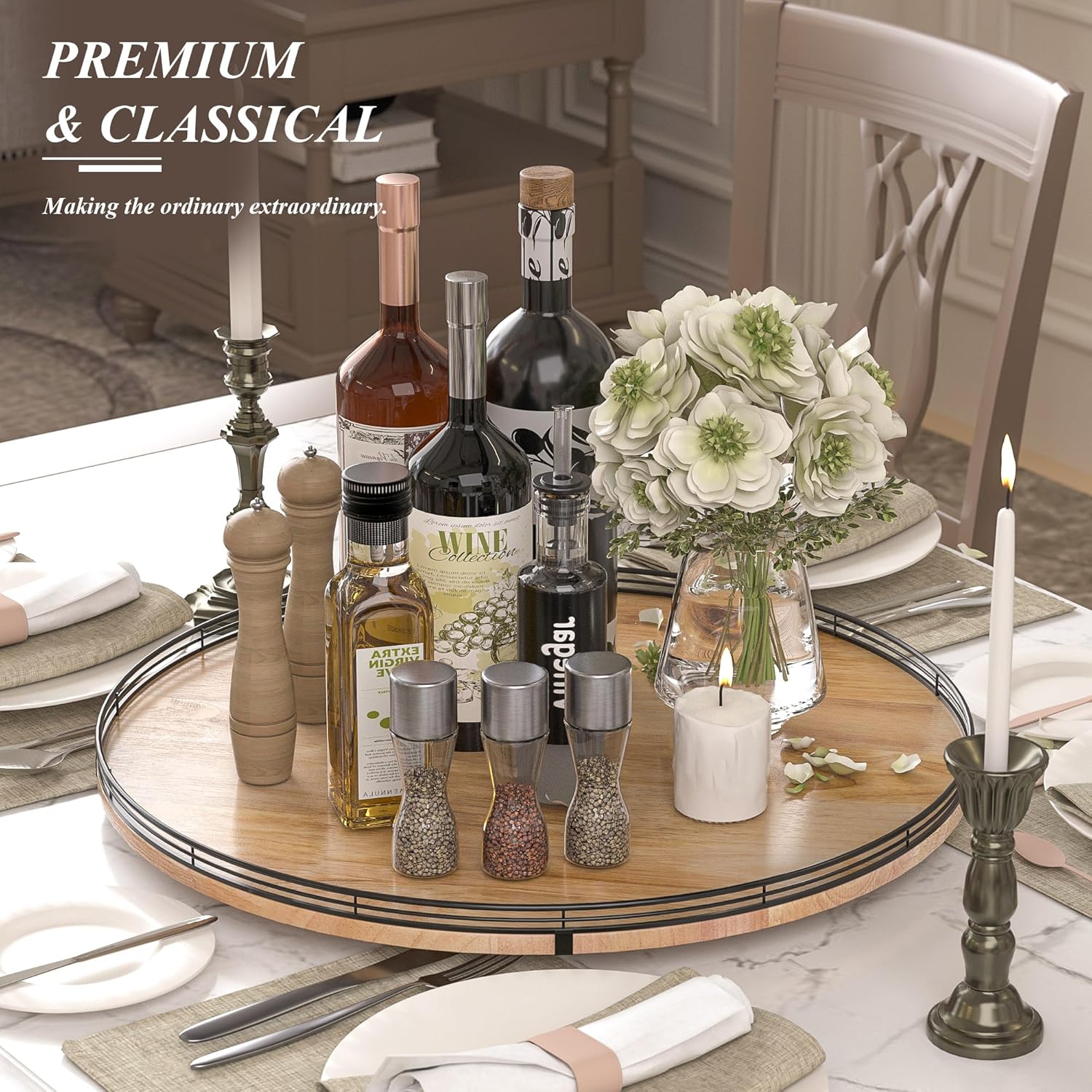 - UPDATED DESIGN: With larger wood base on this lazy Susan for table top, the turntable organizer doesn't wobble, even with heavier items on it. With premium oak wood and classical iron fence make this lazy Susan turntable stylish, functional and adding a touch of rustic charm. itās also very easy to clean. There are included anti-slip pads on the bottom of the lazy Susan for extra surface protection.