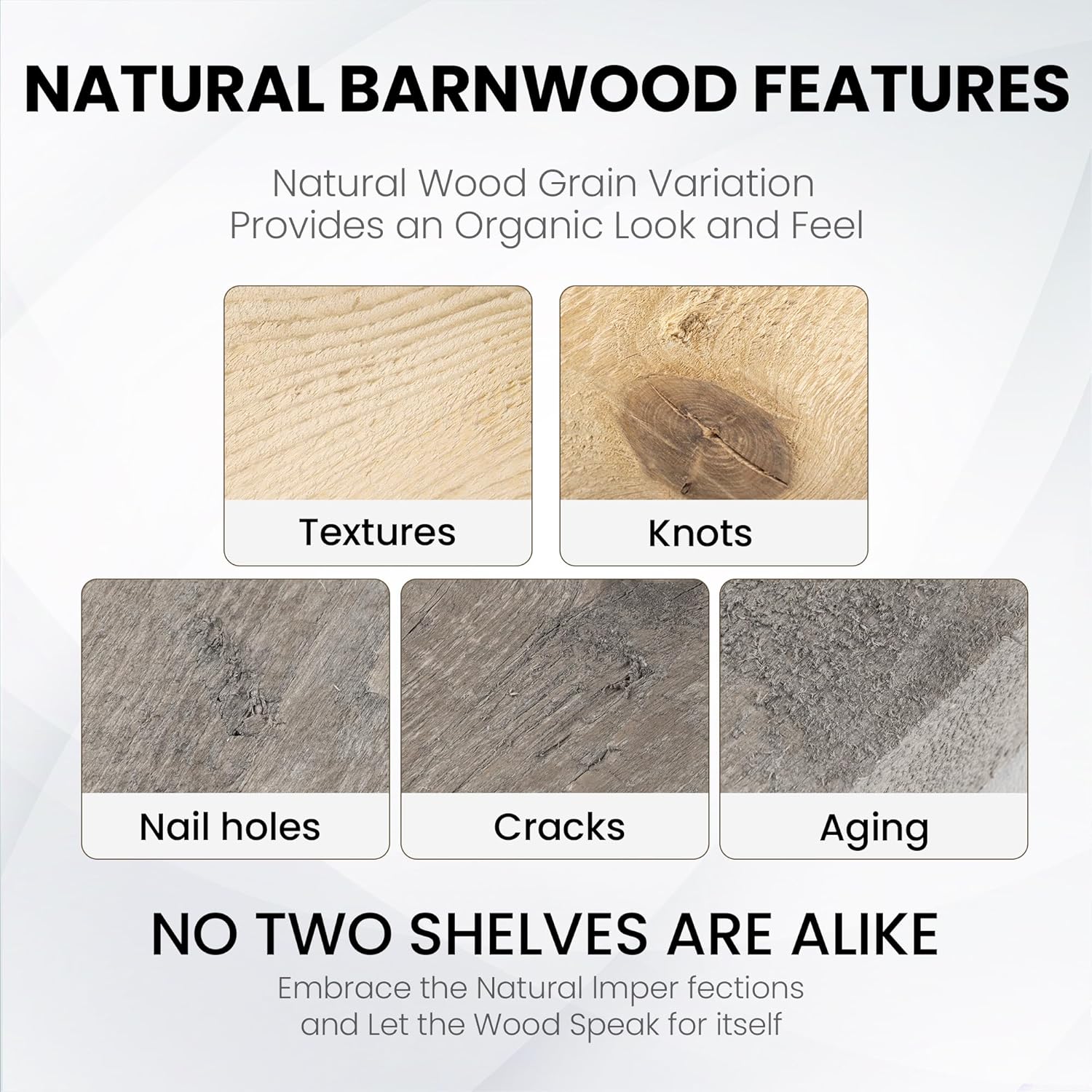 - Thick Reclaimed Wood Shelves: Fun Memories floating shelves are handcrafted from 1.4" thick solid reclaimed wood, measuring 55" x 8". Natural barnwood features—such as nail holes, discoloration, and surface wear—make each shelf a one-of-a-kind, authentic décor accent