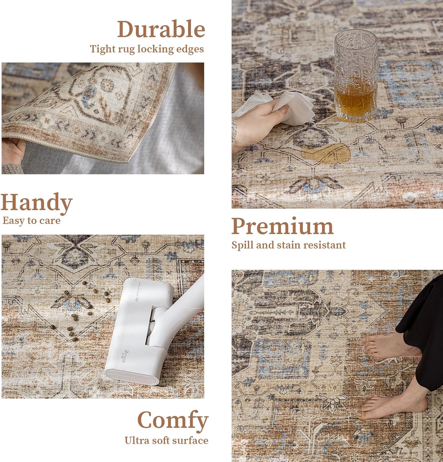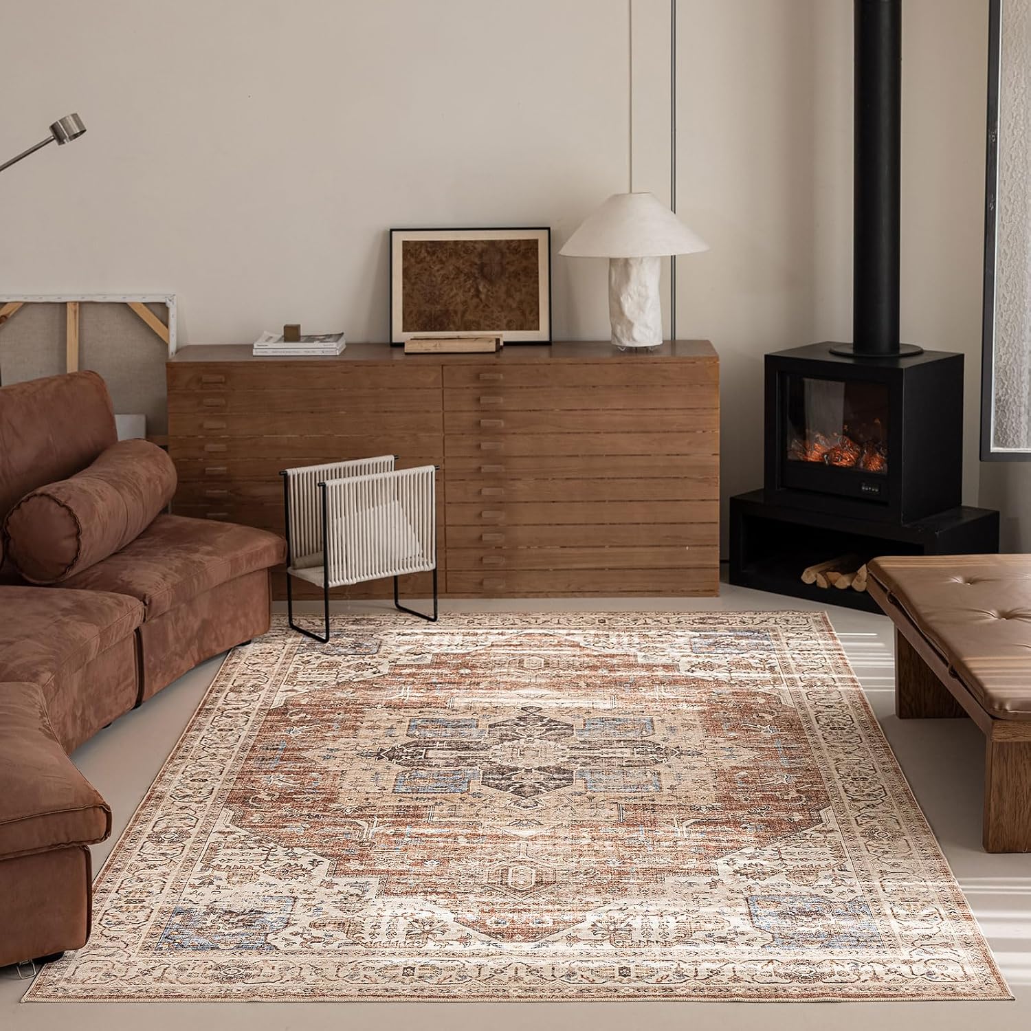 6'x9' Area Rug - Vintage Persian Medallion Design Low-Pile Faux Wool Rug, Non-Slip Backing, Machine Washable, for Living Room, Dining Room, Bedroom (Brick Red)