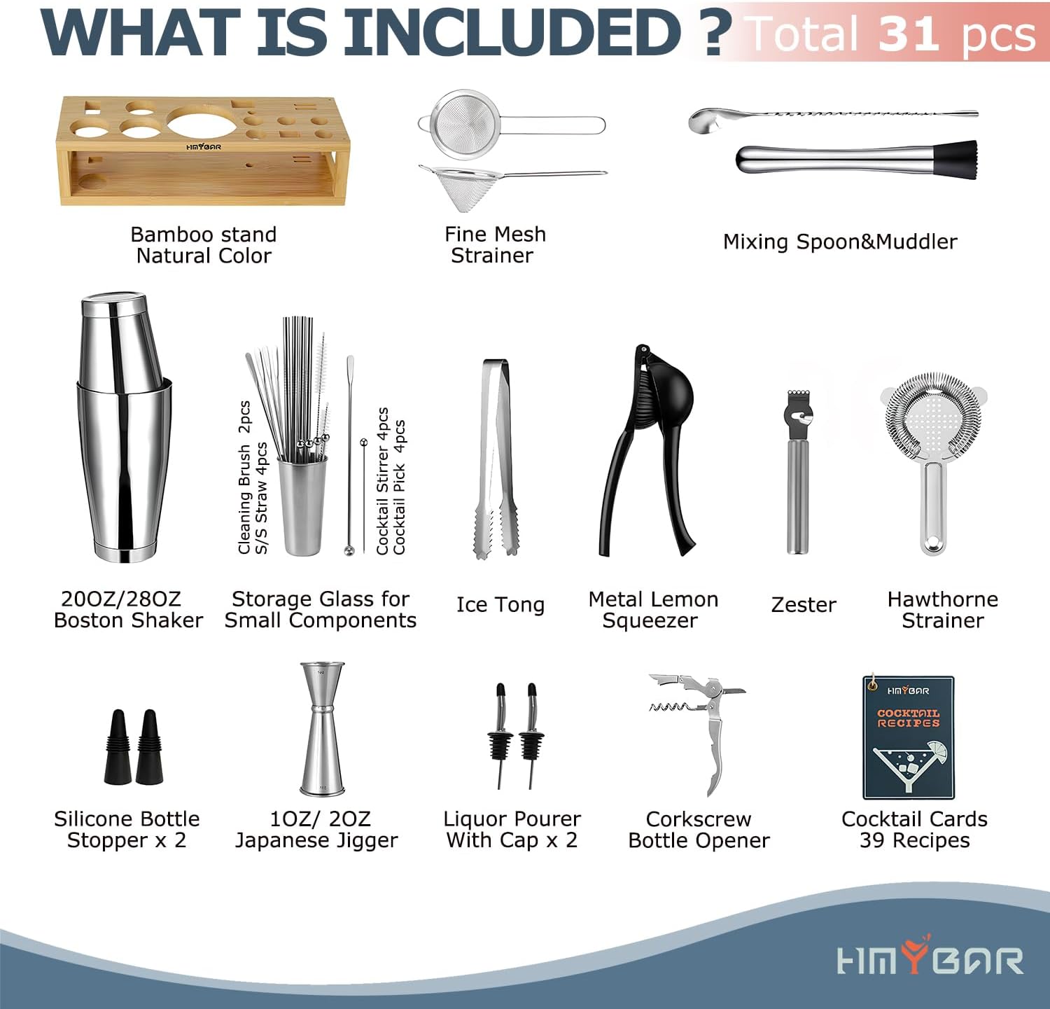 HMYBAR® Mixology Bartender kit | Cocktail Shaker Set | Boston Shaker Set, 20/28 OZ | Martini Making Set for Home Bar.Total 31 pcs incl 39-Recipe Cocktail Cards. Silver Tools. Bamb Stand Natural Color