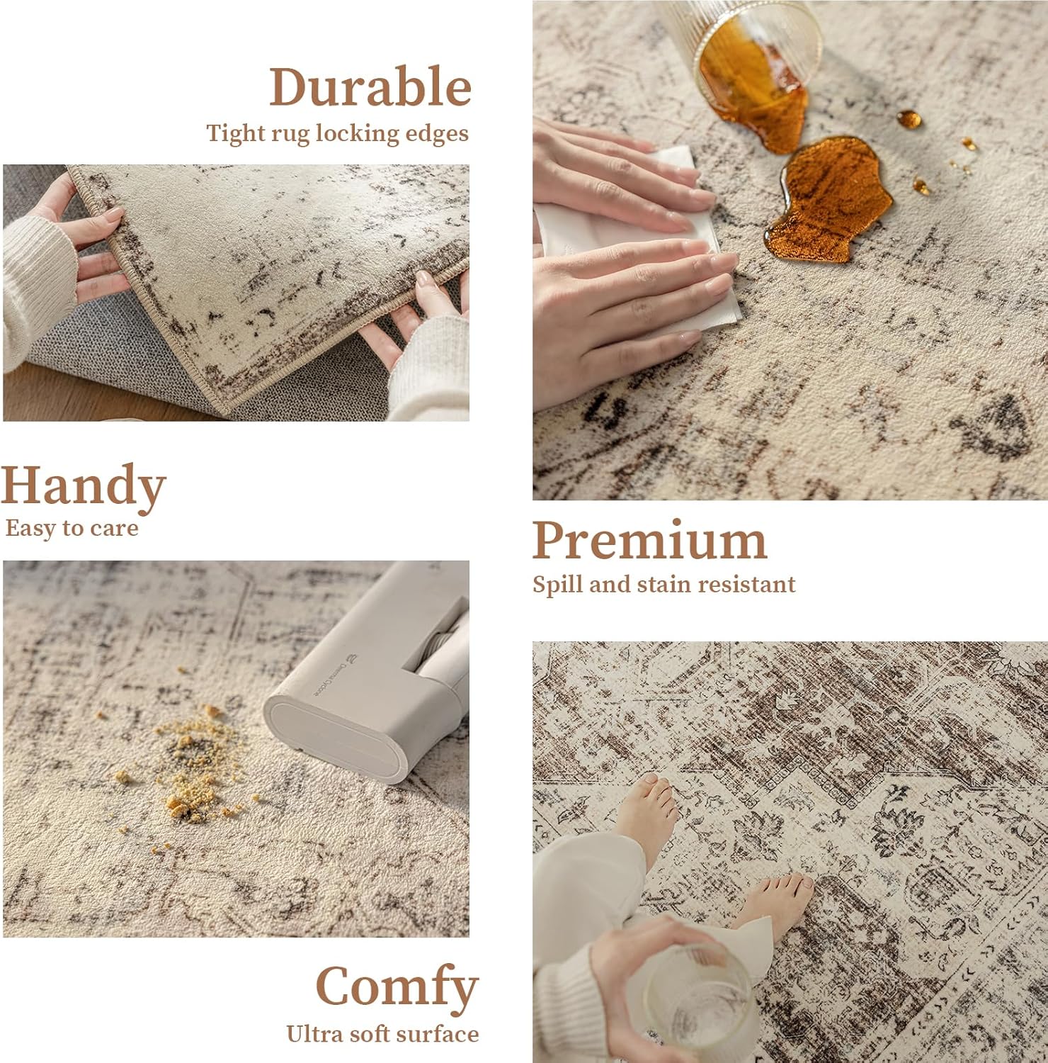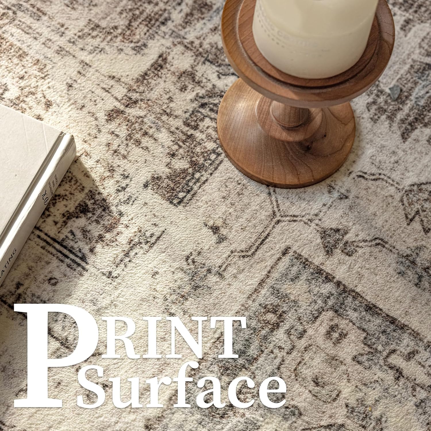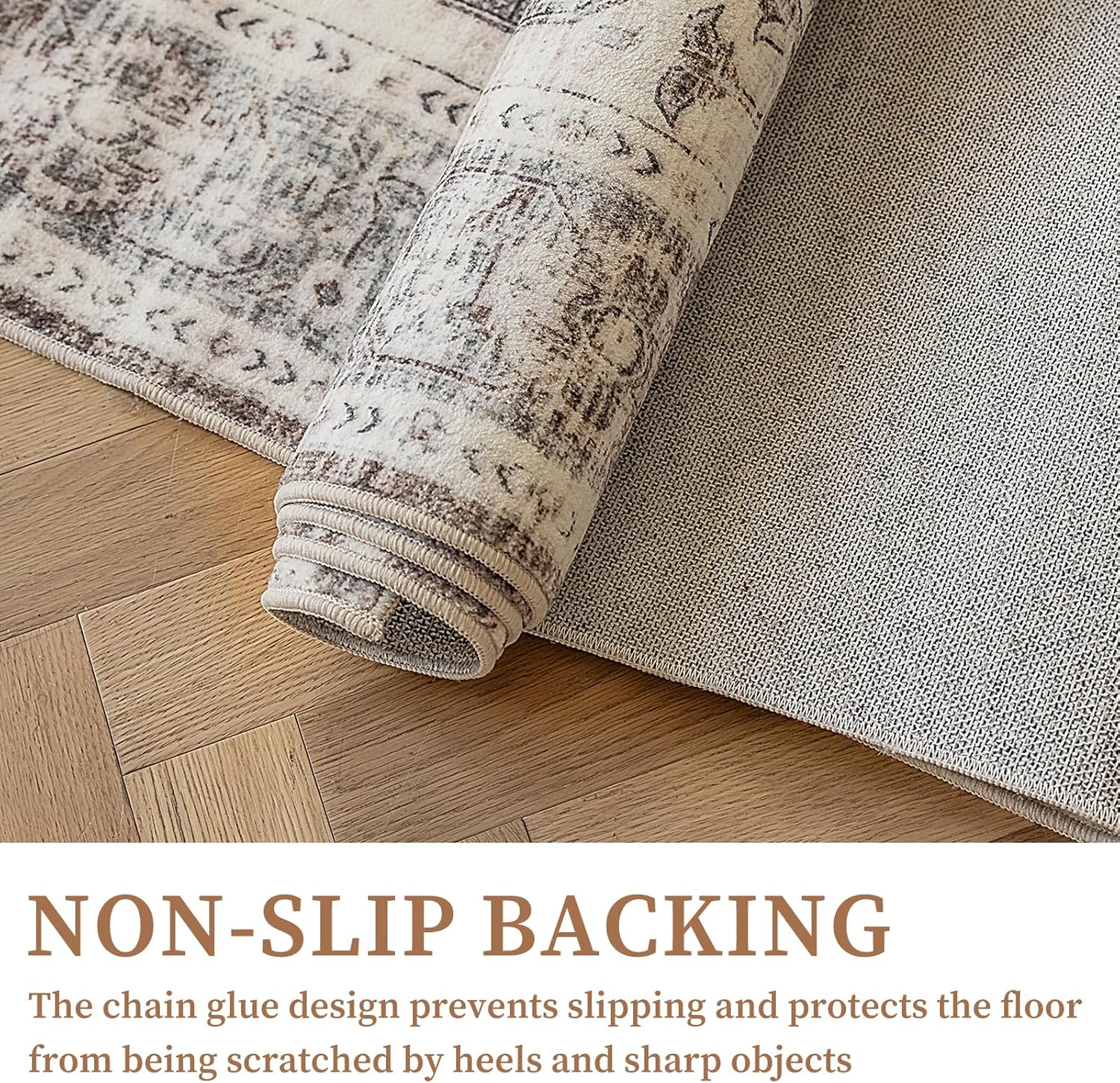 6'x9' Area Rug - Vintage Persian Medallion Design Low-Pile Faux Wool Rug, Non-Slip Backing, Machine Washable, for Living Room, Dining Room, Bedroom (Cream/Taupe)