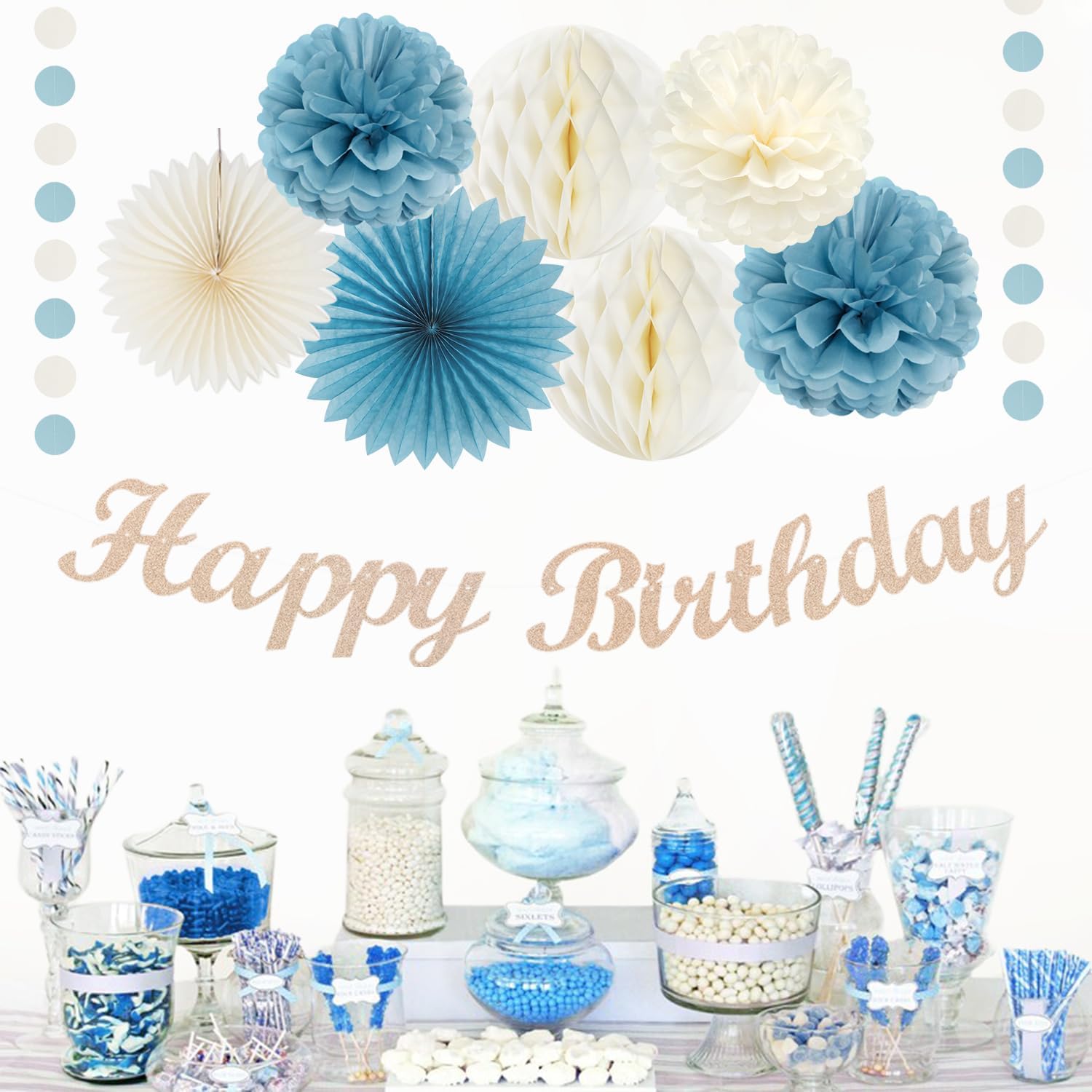 - ćDusty blue white birthday decorations kit includesćThe party decorations kits include 8pcs dusty blue white paper flower, 2pcs light blue paper fans,2pcs 8" white paper Honeycomb, happy birthday garland and dusty blue white streamers.