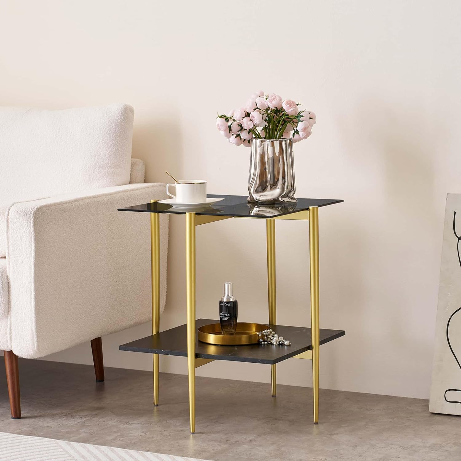 - 【Elevate your Living Room】With this stunning modern elegance end table. Featuring a spacious round top, it offers ample surface area for displaying your favorite decorations, serving drinks, or keeping daily essentials within reach. Its dual-tier structure not only maximizes storage but also adds visual interest to your living area.