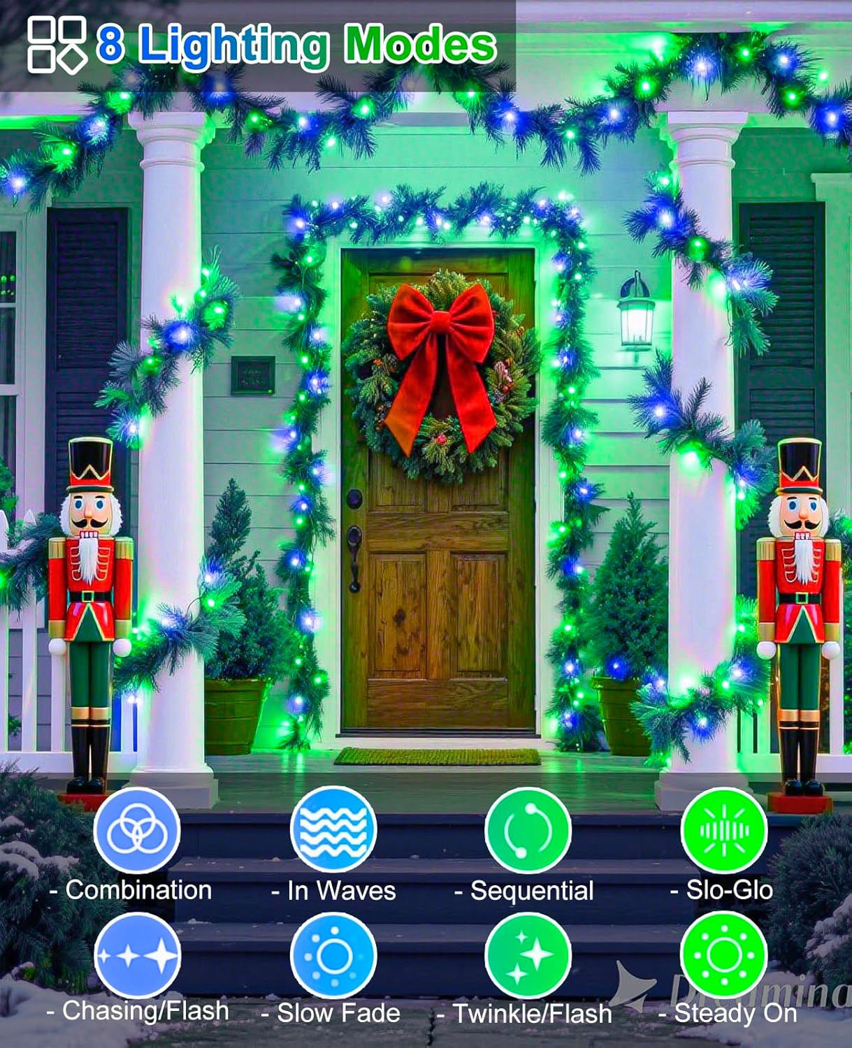 - ć8 Different Lighting ModesćThese Christmas lights outdoor feature 8 lighting modes: combination, in waves, sequential, slo-glo, chasing/flash, slow fade, twinkle/flash, and steady on. Simply press the round button on the adapter to select your favorite mode. Perfect for creating a festive atmosphere and lighting up every corner with cozy, warm lights.