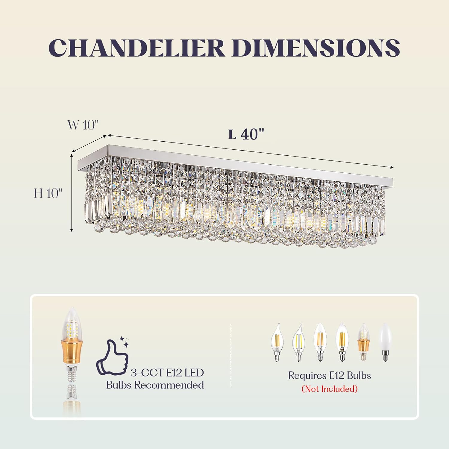 - BULBS NOT INCLUDED: 8 E12 bulbs are required for the rectangular chandelier (max. 40W, not included). 3-color E12 LED bulbs are recommended. You can change the light color from warm (2700K)-cool (6000K)-neutral (4500K) to create different atmospheres for different occasions, and the crystal ceiling light is fully dimmable if you use both dimmable bulbs and a compatible dimmer switch