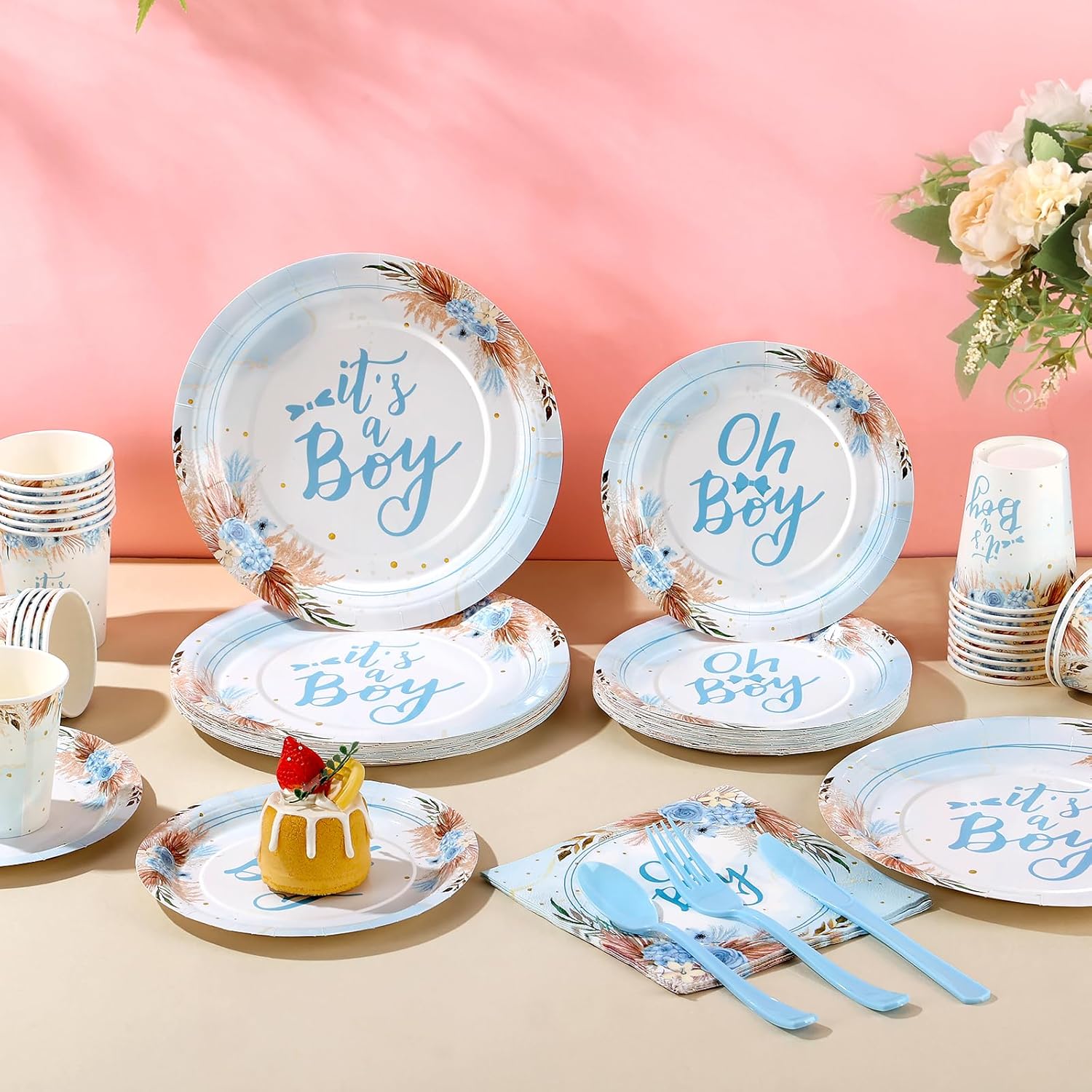 168 Pcs Baby Boy Shower Decorations, Its A Boy Baby Shower Decorations, Blue Baby Shower Plates and Cups and Napkins Sets Serves 24, Boho Fall Oh Baby