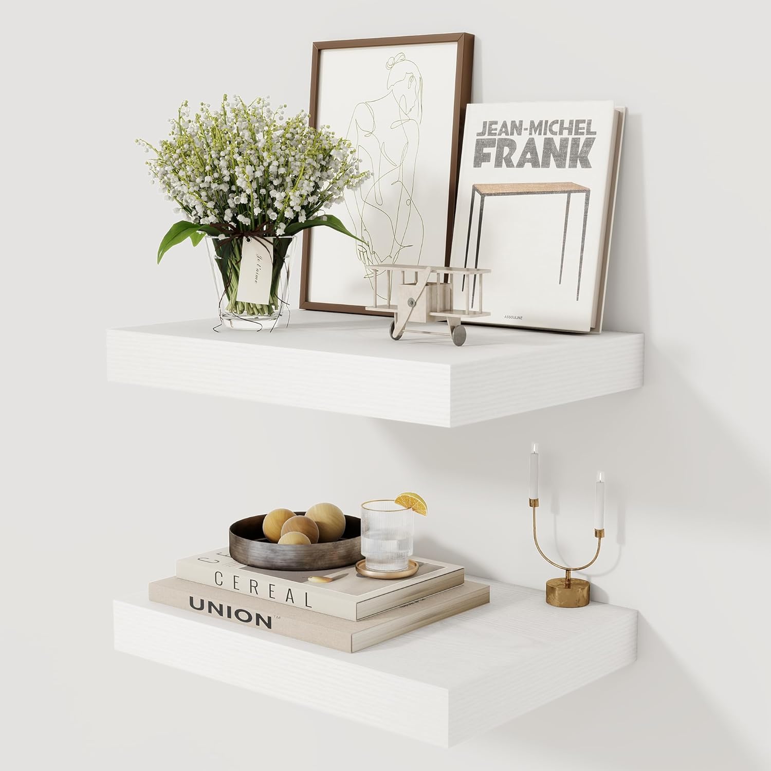 - ćFARMHOUSE RUSTIC WALL SHELFćThese floating shelves are made of premium engineered wood board and invisible one-piece bracket. The rustic wooden grain surface add character and warmth to any modern or traditional interior with these thick floating shelves, contrast shelves at staggering heights on the wall or mount side-by-side or in the corner for a clean streamlined look.