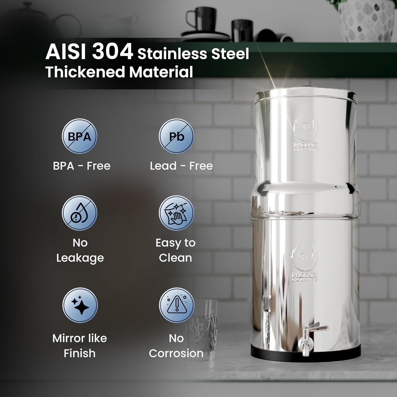 - 𝐀𝐥𝐥-𝐈𝐧-𝐎𝐧𝐞 𝐒𝐨𝐥𝐮𝐭𝐢𝐨𝐧 - The Phoenix Gravity system comes complete with an AISI 304 stainless steel tank, 2 Smart Carbon (Black) filter elements, a user-friendly AISI 304 stainless steel stand and Spigot, and all necessary components for easy assembly, making it ready to use right out of the box.