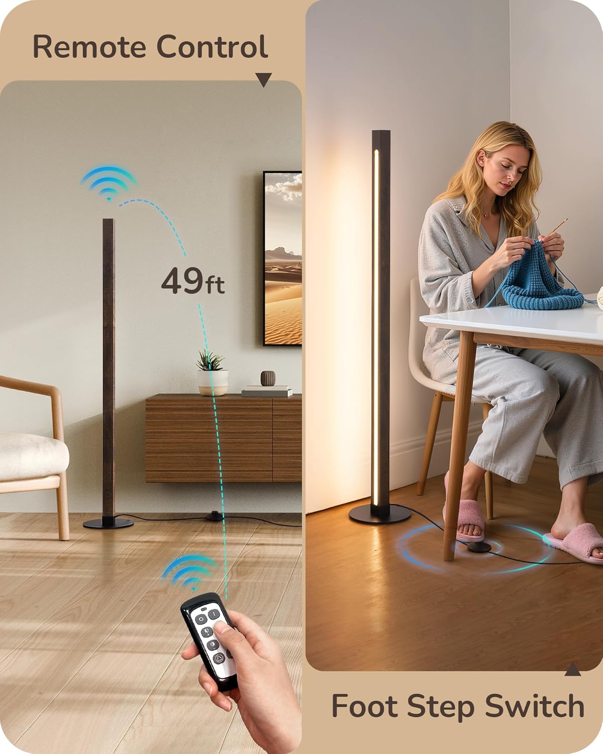 - [Remote & Foot Switch] Use the included remote control (up to 49ft range) for convenient access to this led corner lamp, or operate via the foot switch—tap to ON-2700K/4500K/6000K-OFF, or long press for stepless dimming