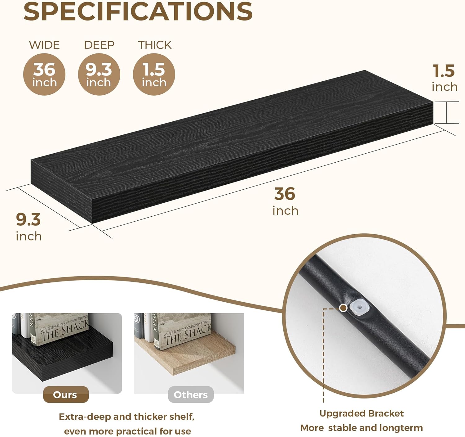 - Generous Depth for Stylish Display: With a spacious 9.3-inch depth, these floating shelves provide ample room for both dĆ©cor and daily essentials. Their wide surface easily holds books, framed photos, plants, and moreābringing both function and flair to your space. The sturdy 1.5-inch thickness adds a bold visual presence, transforming any wall into a practical yet eye-catching centerpiece.