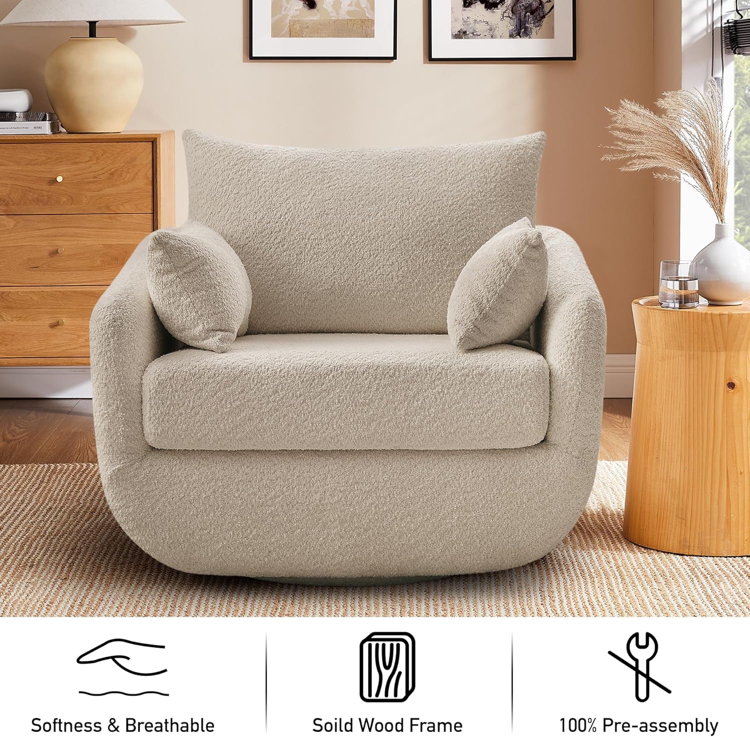 360° Swivel Accent Armchair, 39.3" Oversized, Sherpa Boucle Fabric Sofa Chair with Removable Back & Arm Pillows, Swivel Chair with Cozy Soft Padded, No Assembly Required (1, Camel)