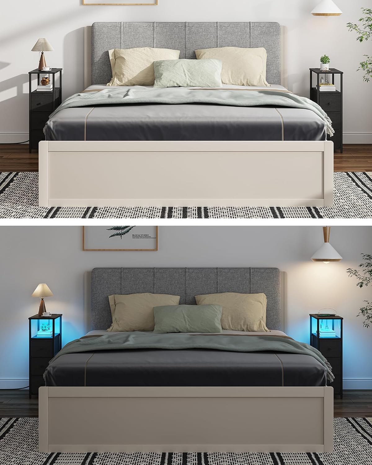 TUTOTAK Narrow LED Night Stand with Charging Station, Slim End Table with Plugins, Tall Side Table with 3 Fabric Drawer, Small Bedside Table with Storage, for Living Room, Black TB01BK086L